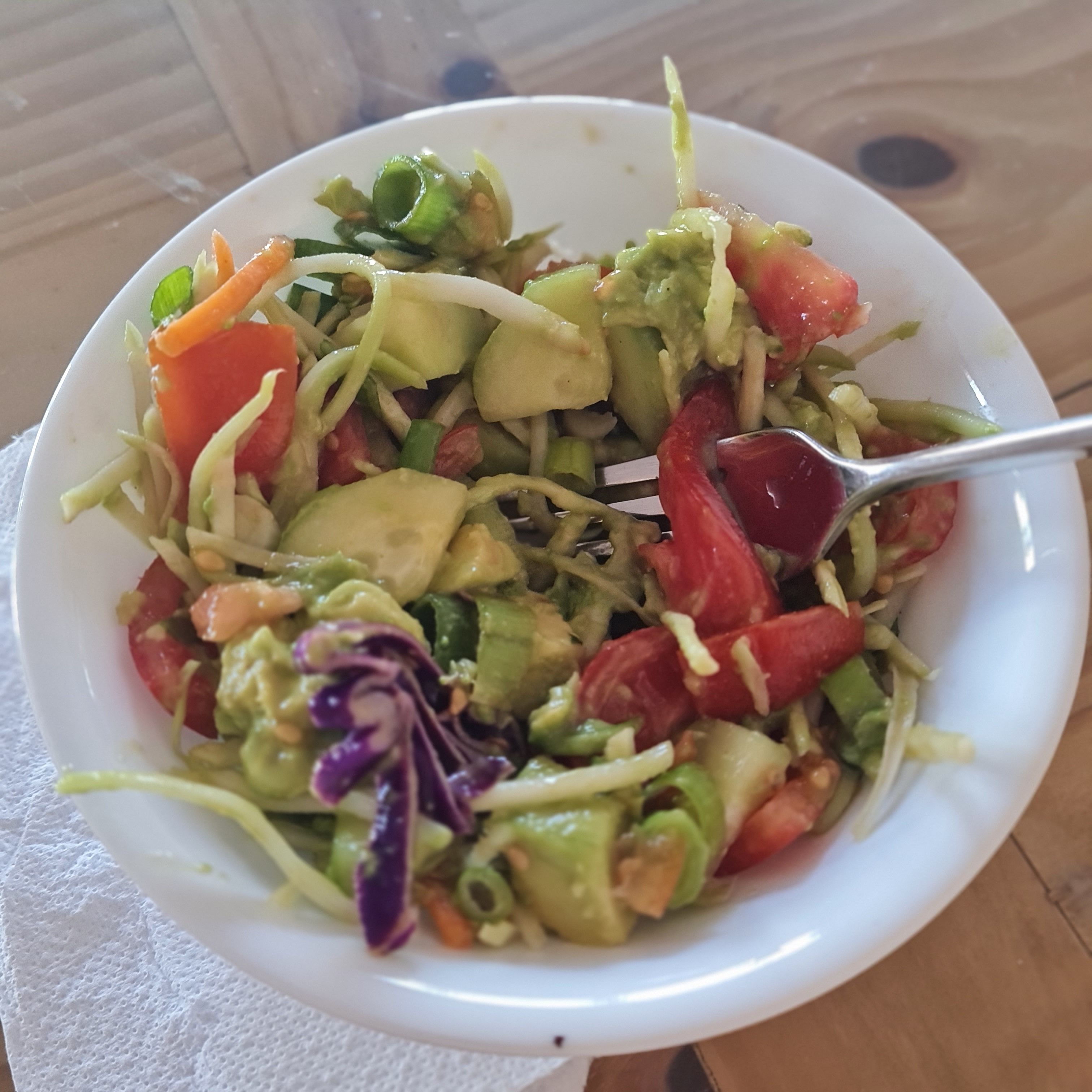 * cool summer salad (cucumber, green onion, tomato, broccoli-slaw, avocado, lemon juice, salt) & one slice of 9 grain sourdough bread