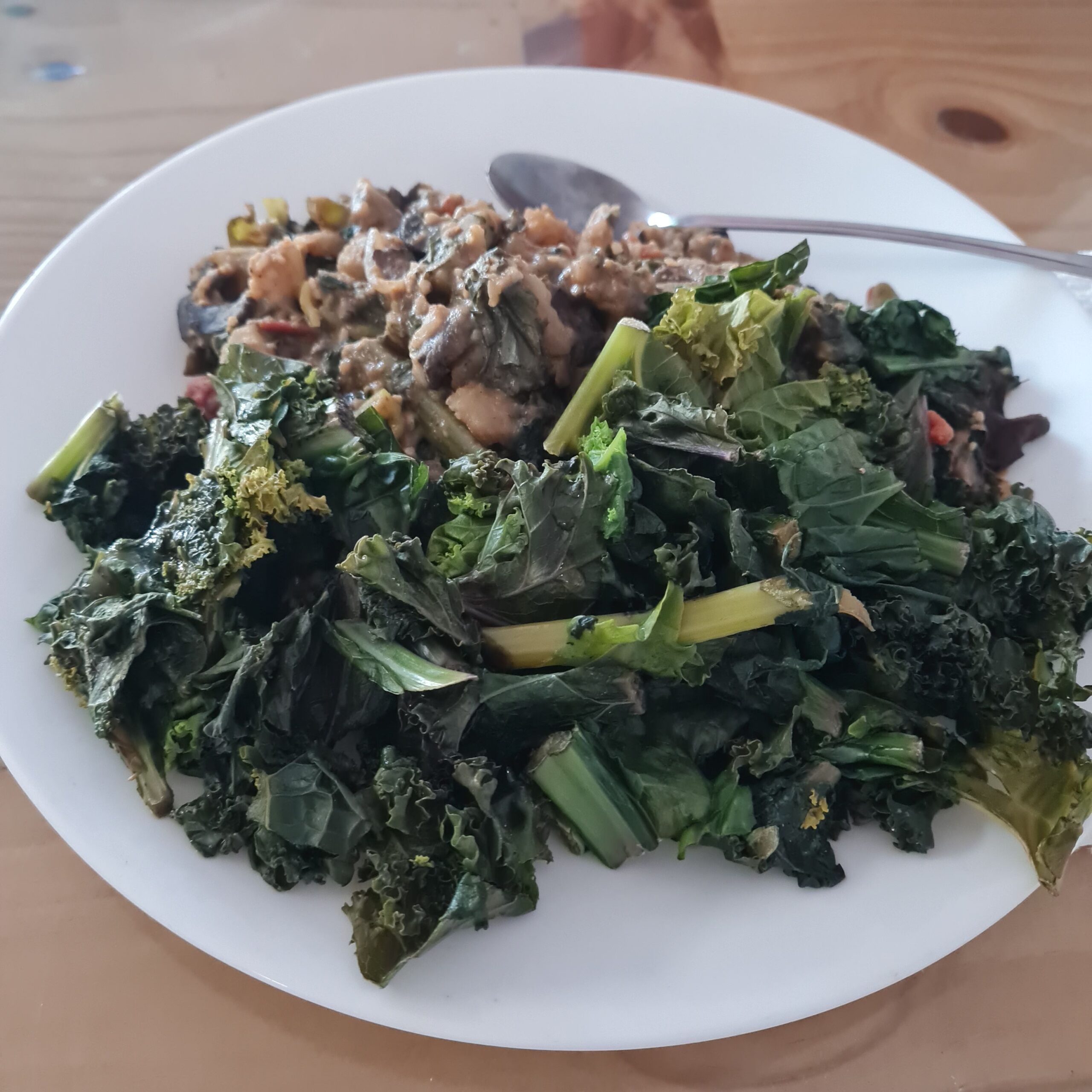 * whole wheat pita pocket stuffed w/ cowboy caviar (onion, tomato, mushrooms, diced potato & lots of steamed kale all wautéed in veggie/peanut broth) & a bit of Dr. Greger cheesy sauce added