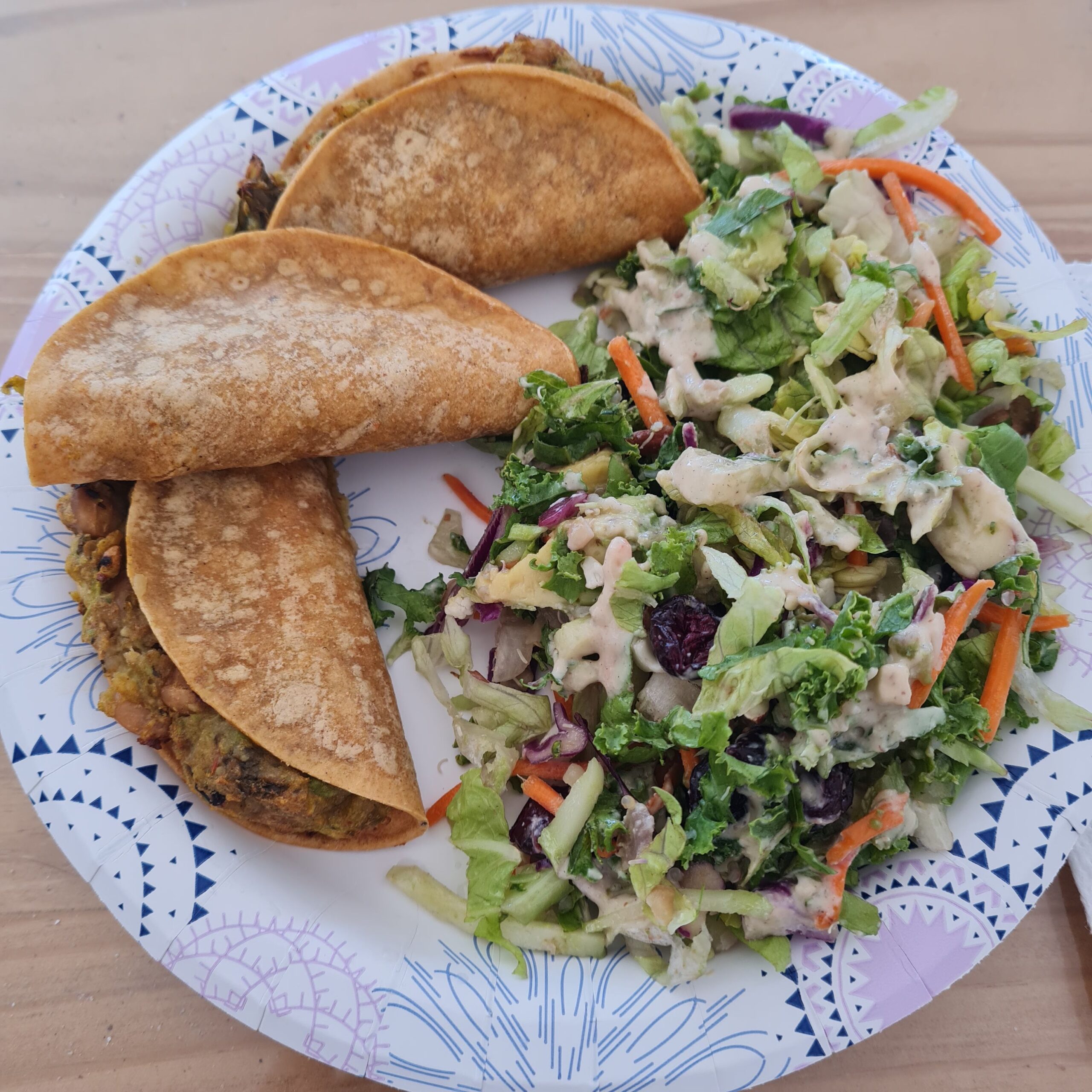 * mini oilfree tacos (cooked in airfryer) w/ potato, avocado, salsa, some black-eyed peas from chili w/ mushrooms