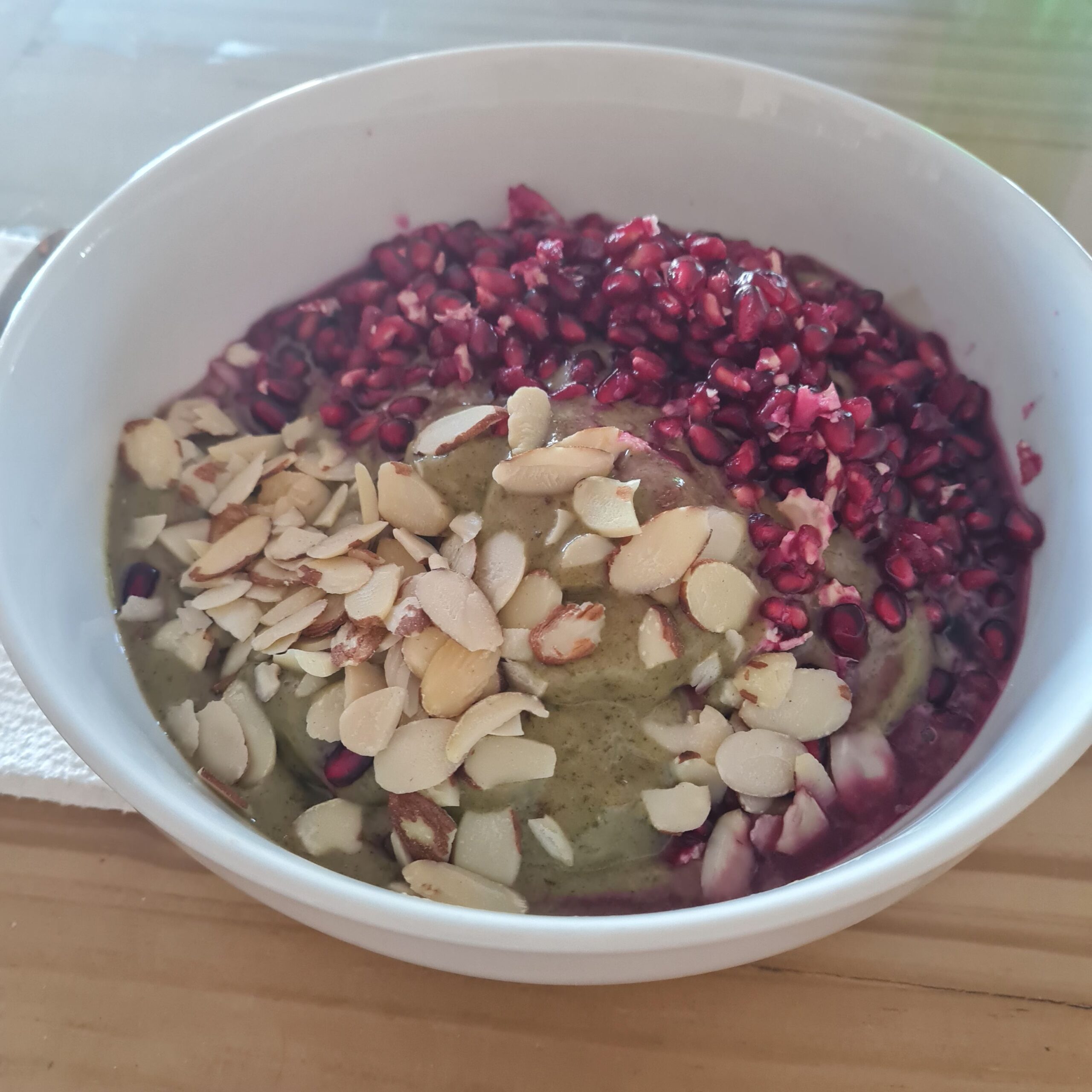 * nice cream (made of frozen bananas, kale, cacao & peanut powder, dates, water & topped w/ thin sliced raw almonds, sprinkle of palm XL-sugar & fresh pomegranate)