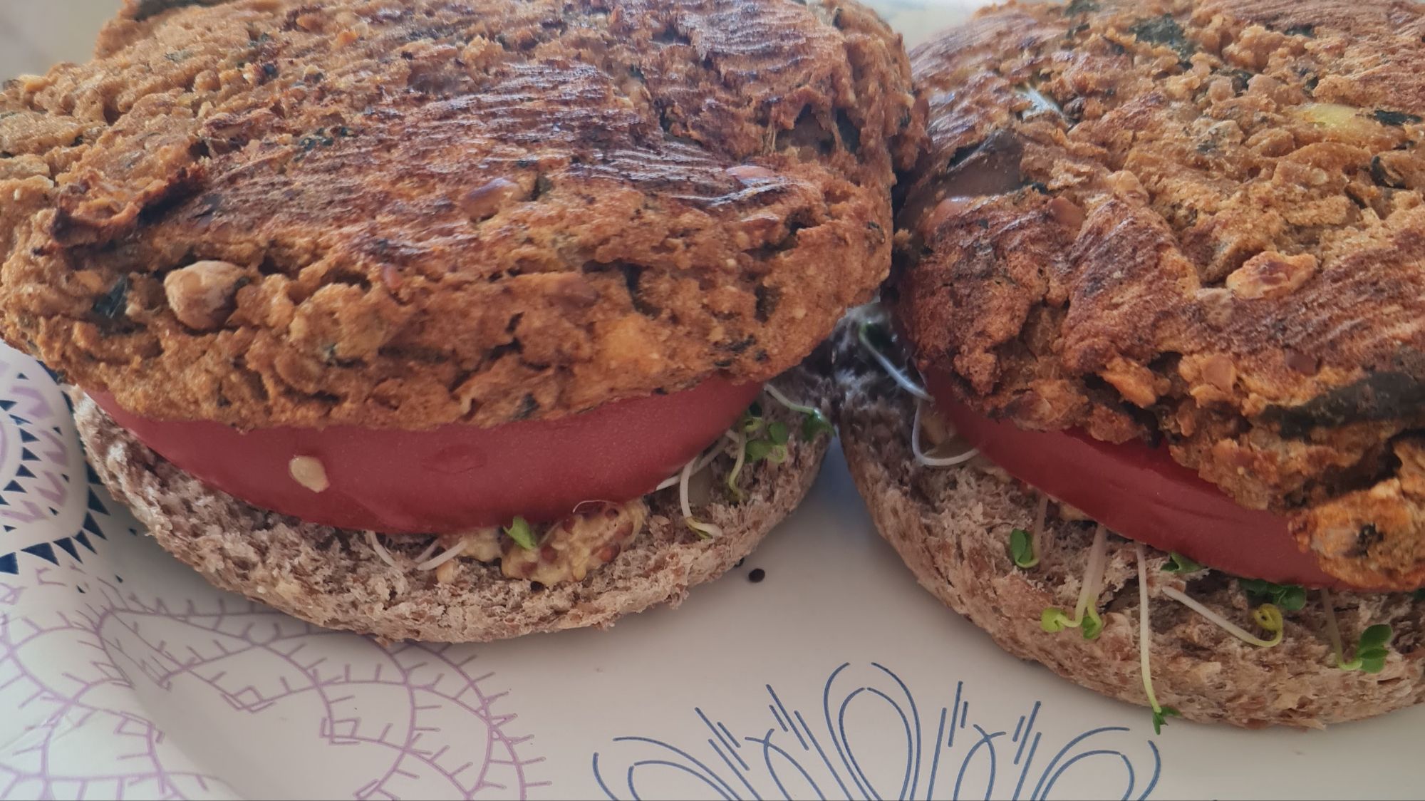* 2 open-faced bean burgers made of black-eyed chili, small potato, kale on Ezekiel 4:9 sprouted grain muffins w/ avocado, tomato, broccoli sprouts, mustard