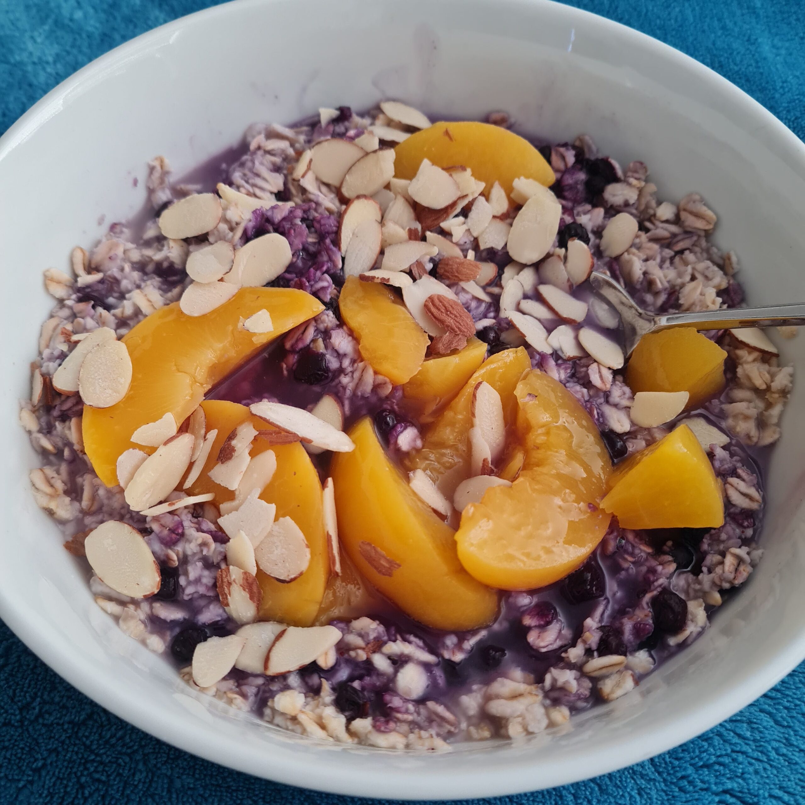 * rolled oats, peach, blueberries & thinly sliced almonds