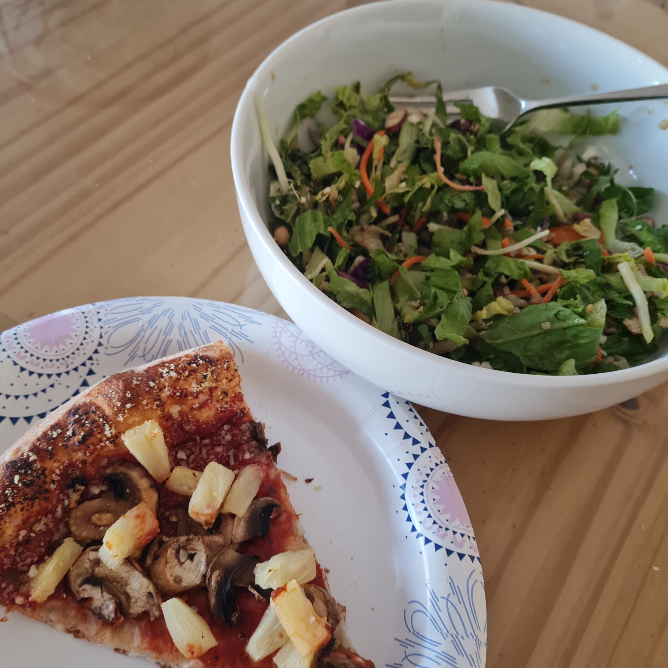 * dairy-free pizza w/ pineapple/mushroom & chopped gorilla salad
