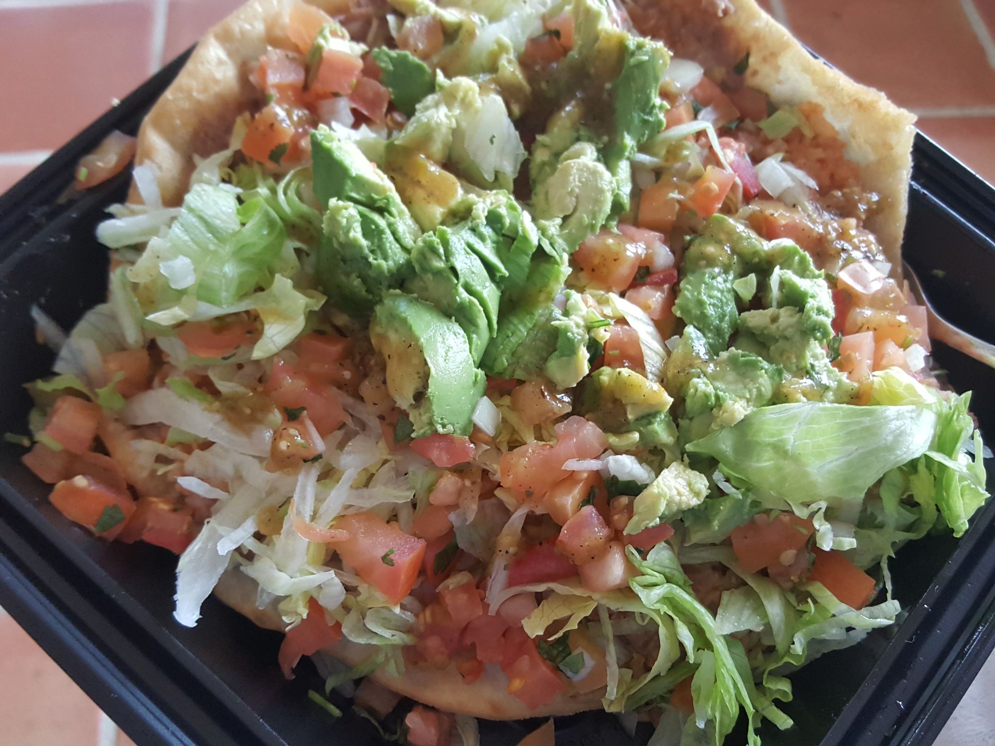 * flying saucer tostada (beans, rice, lettuce, tomato, onion, avocado on XL-crispy flour tortilla)