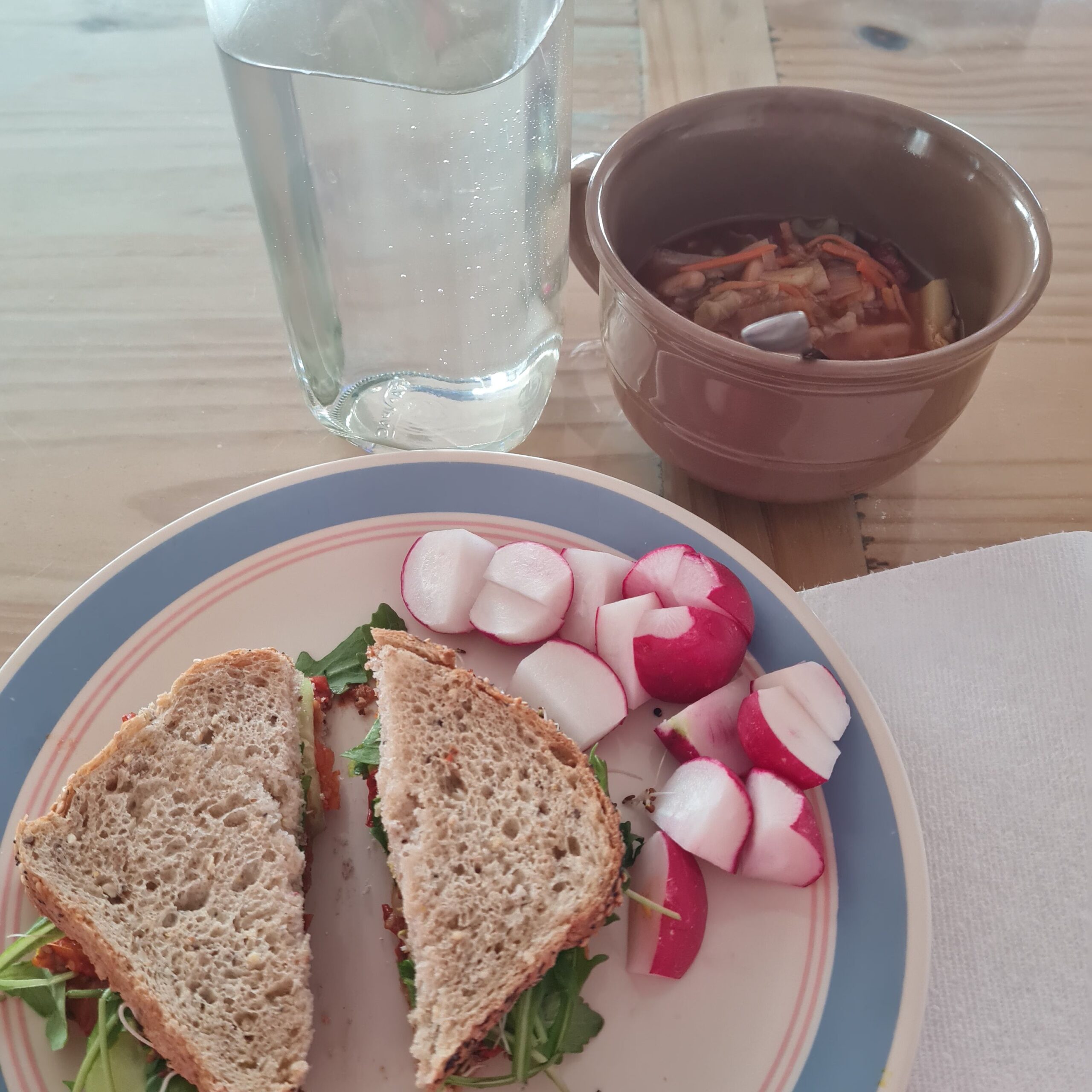* mug of leftover cabbage veggie soup & fresh radishes