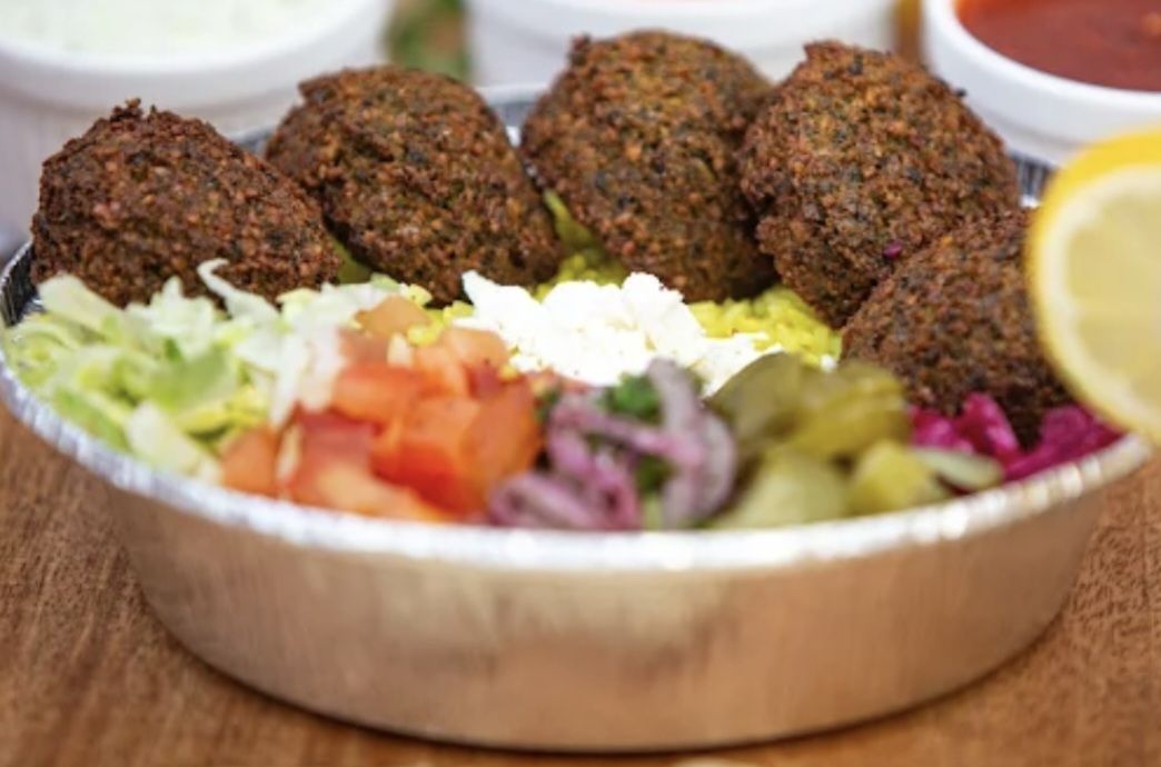 * XL-fried chickpea falafel balls served on rice w/ salad (lettuce, tomato, onion, dill pickle)