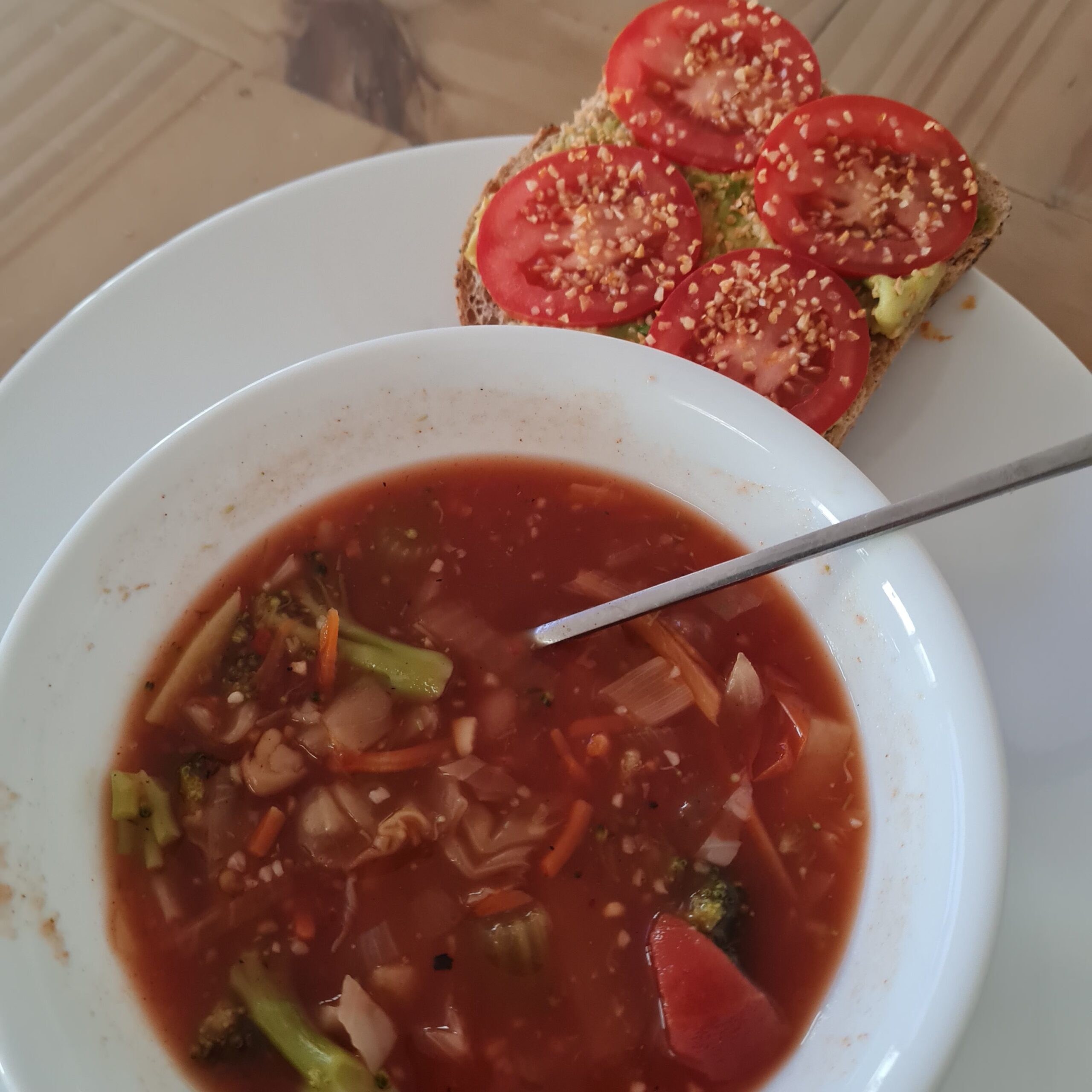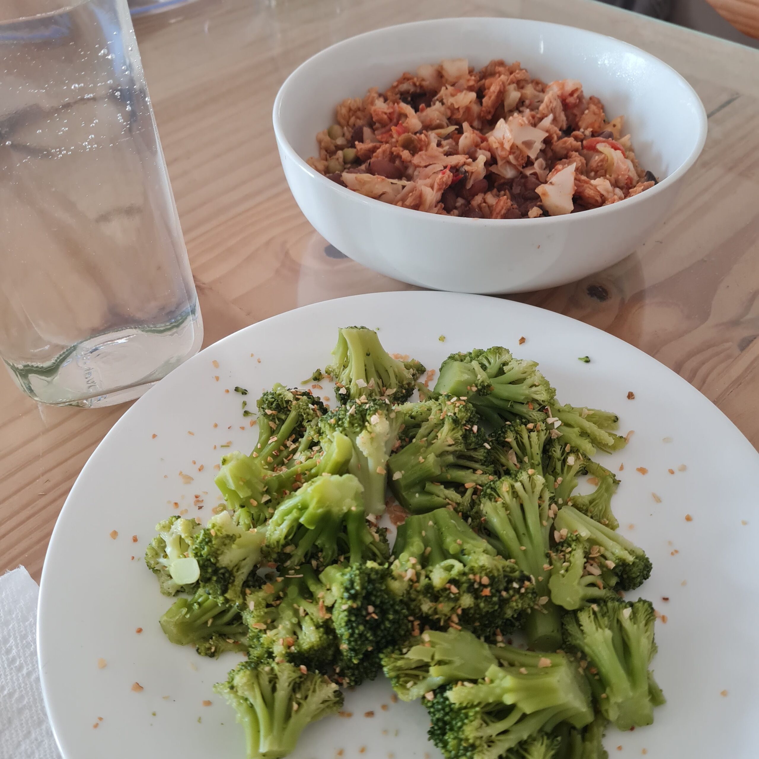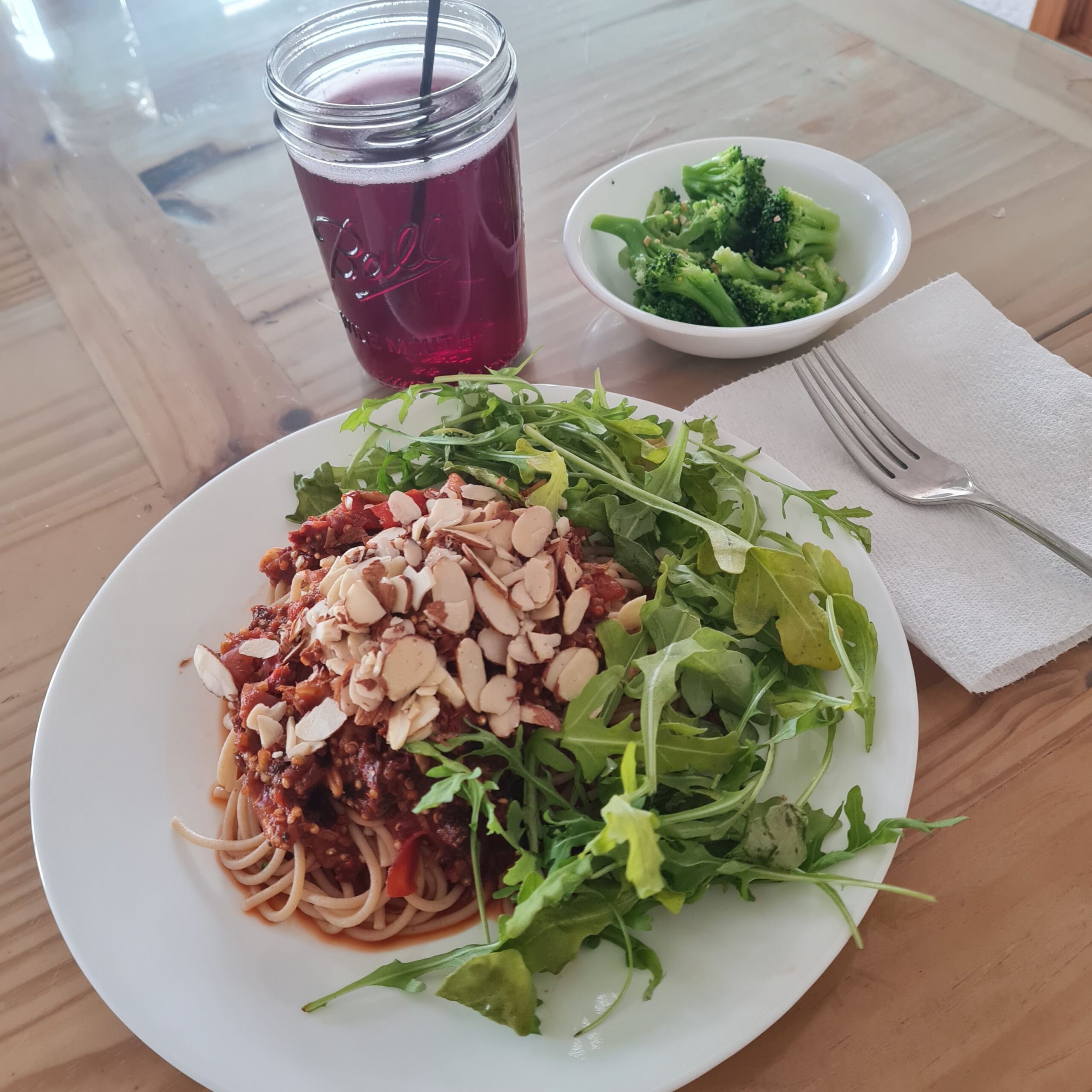 * steamed broccoli, VERY veggie quinoa-thickened ghetti, fresh arugula, unsweetened sparkling grape juice