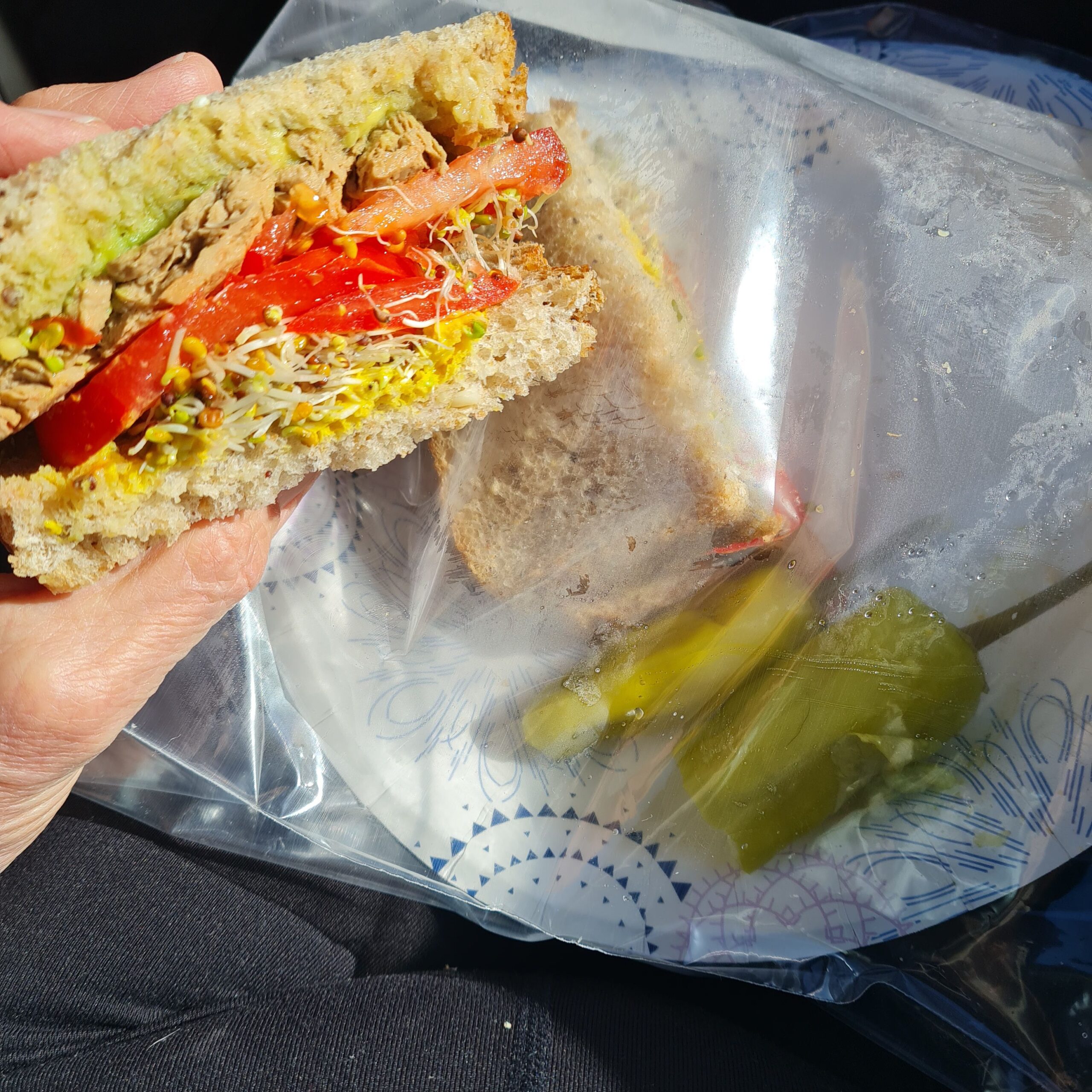 * breakfast sandwich (Meati mushroomi wautéed maple patty w/ tomato, avocado, broccoli-alfalfa sprouts, mustard on 9 grain sourdough toast