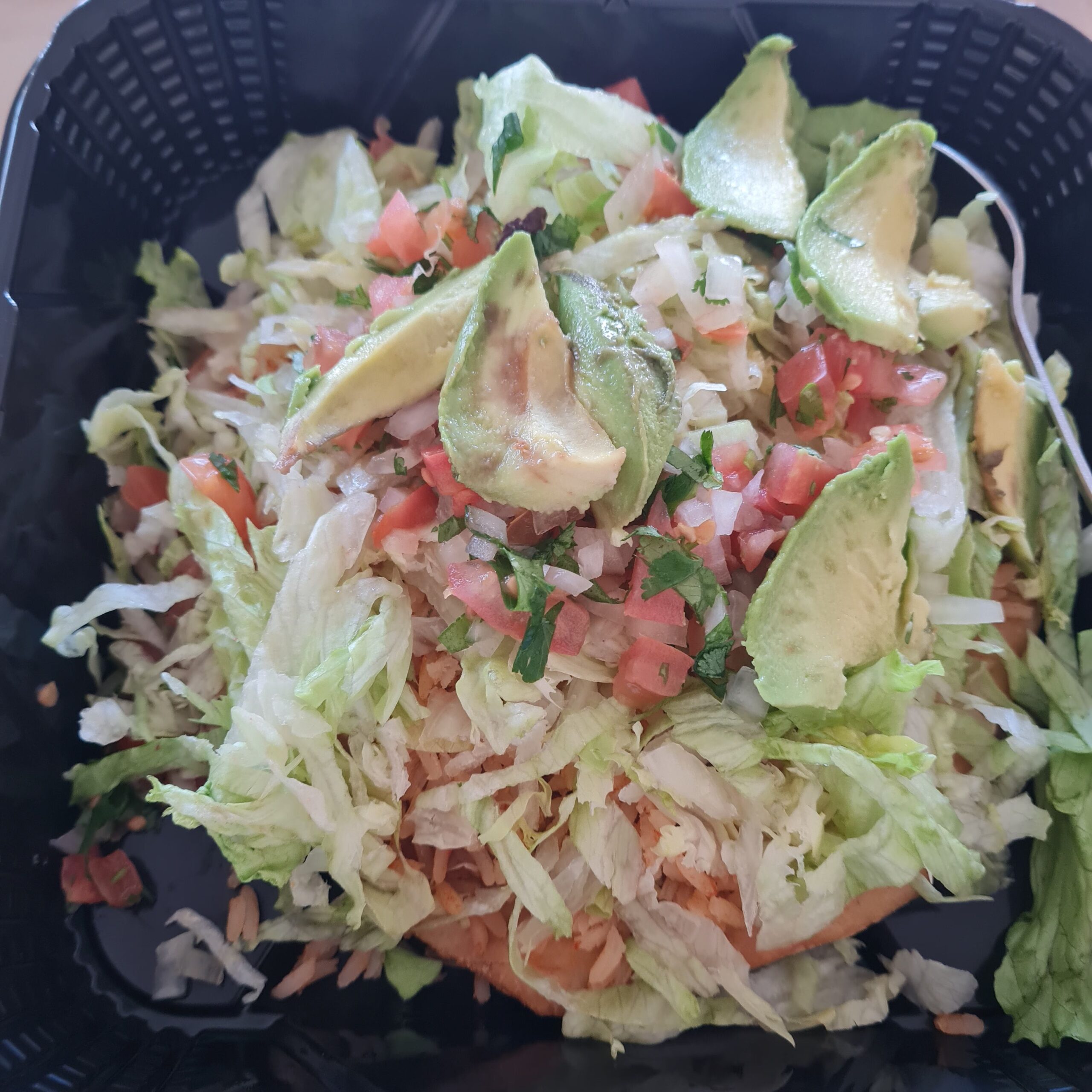 * flying saucer tostada (beans, rice, lettuce, tomato, onion, avocado on XL-crispy flour tortilla) & pineapple juice