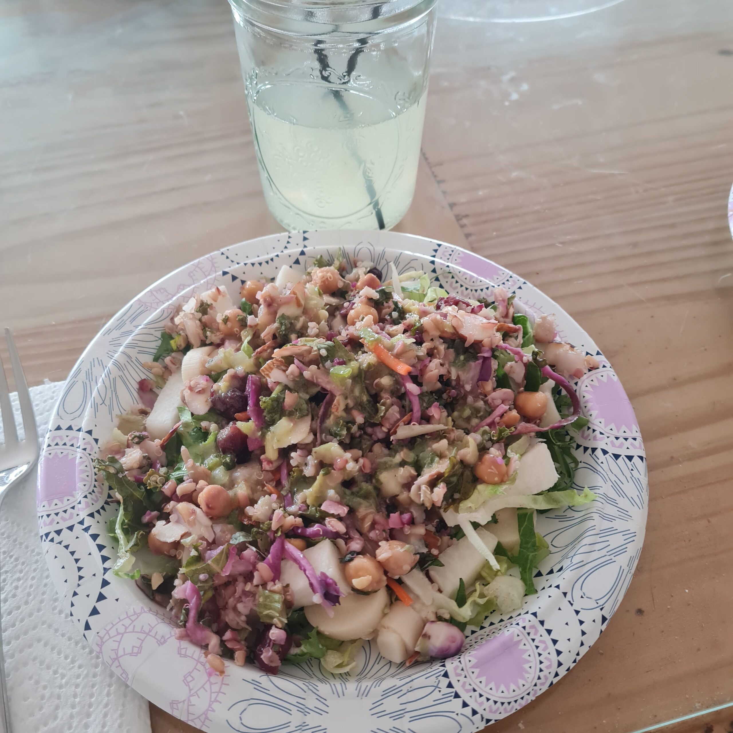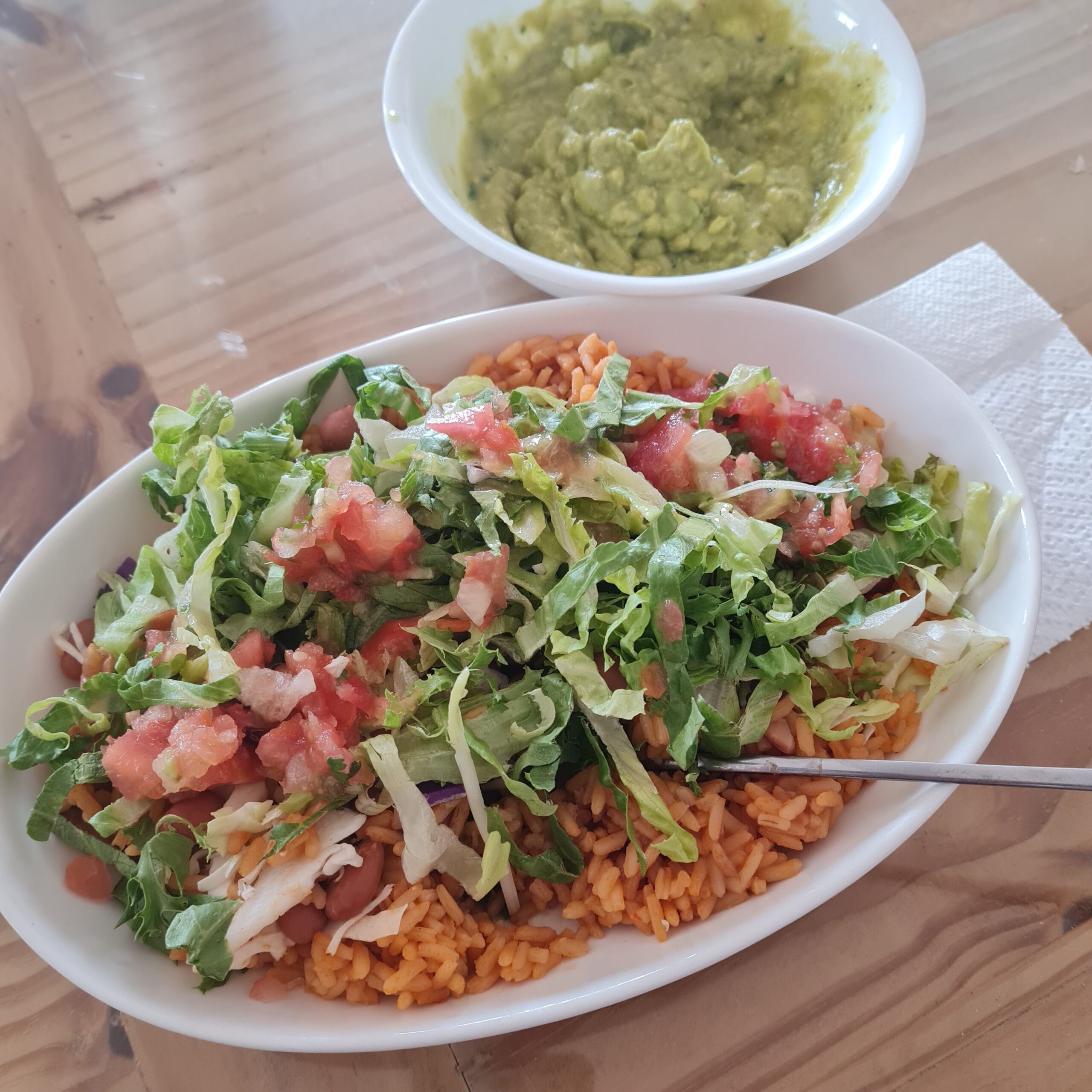 * pinto beans, rice, cabbage bowl w/ added chopped salad, salsa & guacamole