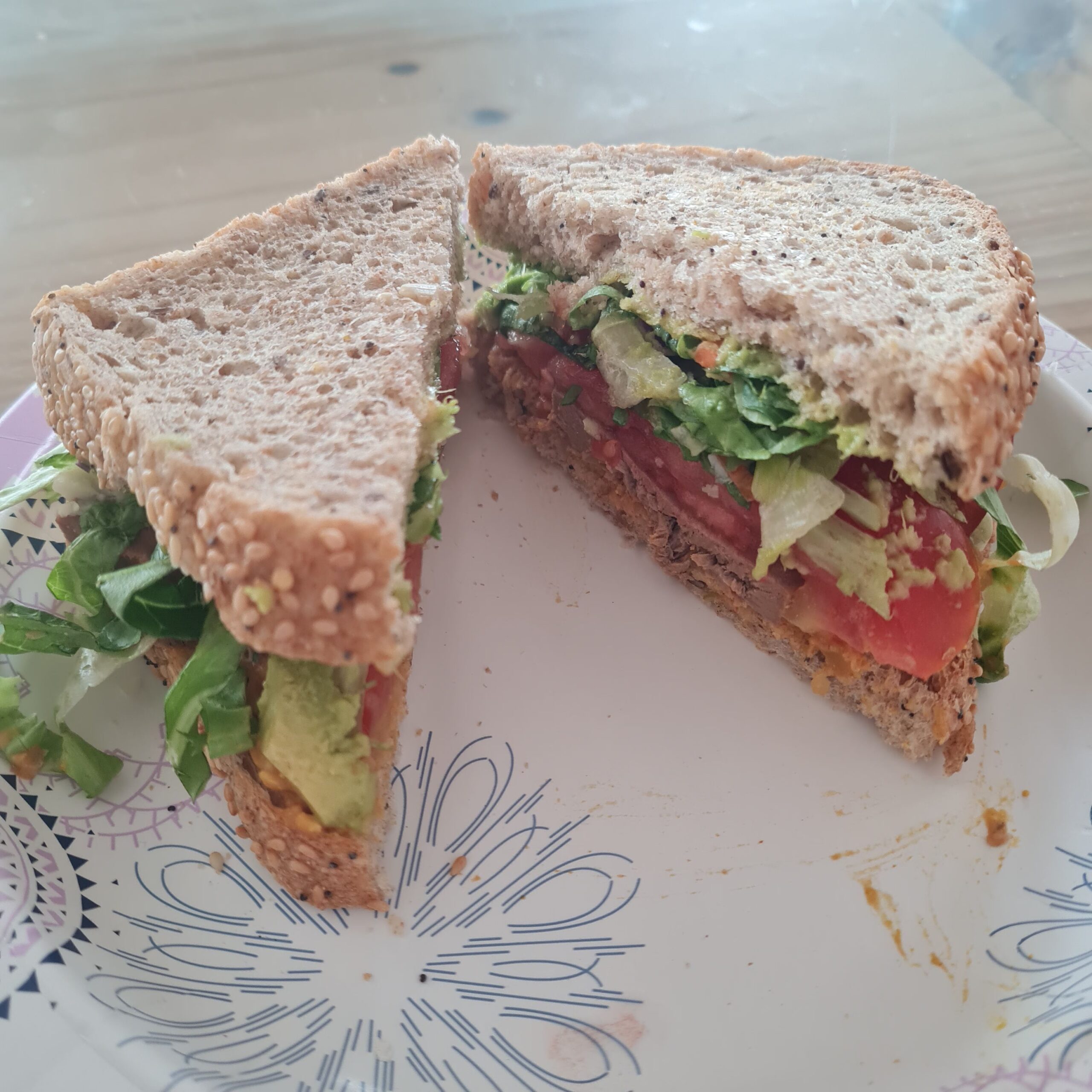 * Meati Brand (mushroom-i) cutlet sandwich on 9 grain sourdough toast w/ halfcup XL-lemonade