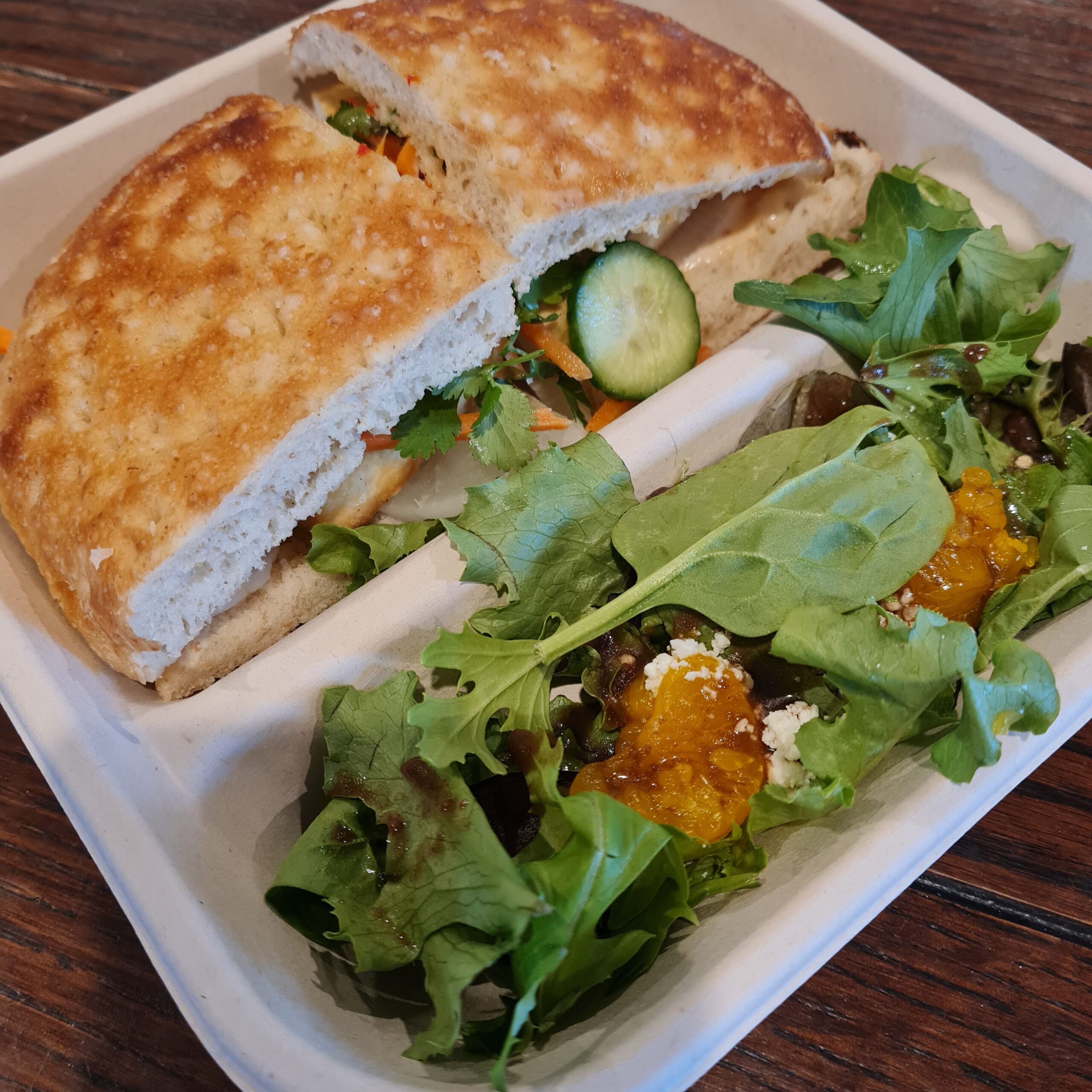 * tofu banh mi sandwich (roasted tofu, cilantro, cucumbers, pickled carrots, fresno chilis, pickled white radish, sweet chili aioli) & side spinach salad (Thank you Agnes!)