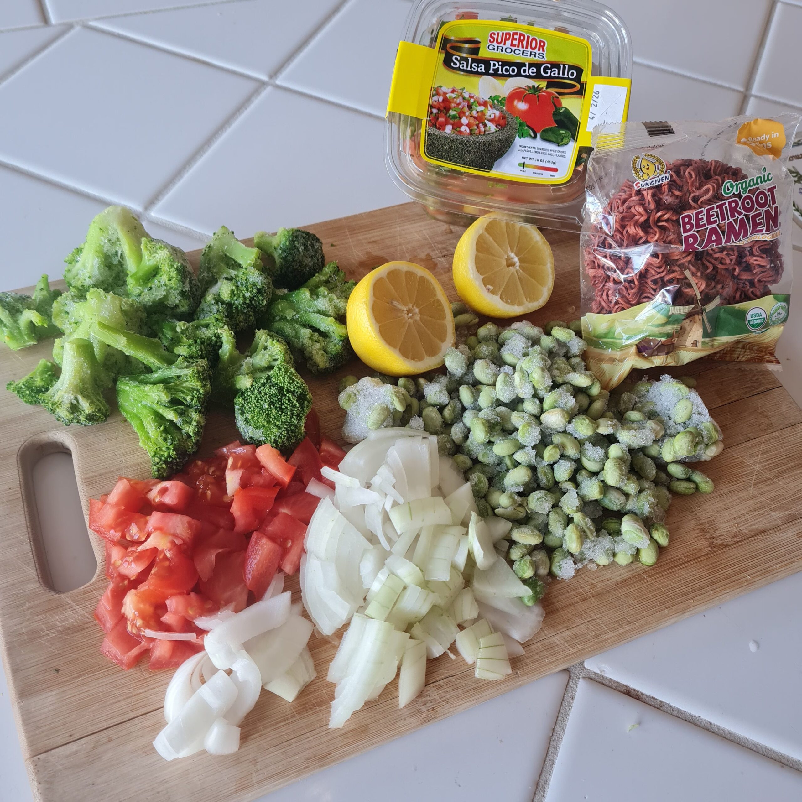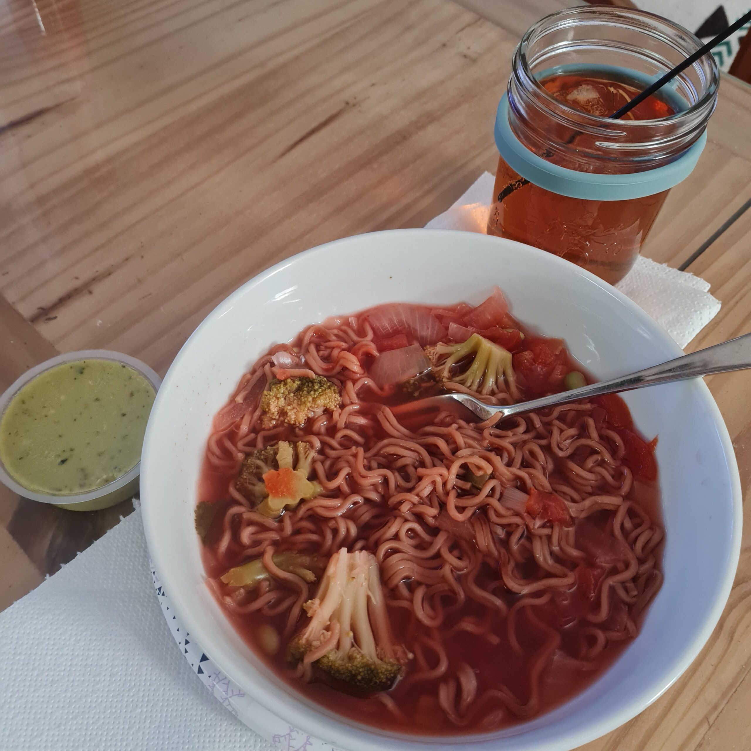 * veg noodle soup (w/ broccoli, onion, tomato, edamame, lemon, salsa, beetroot noodles, veggie broth) & plain sparkling water w/ just a shot of Tuscanini Organic XL-soda