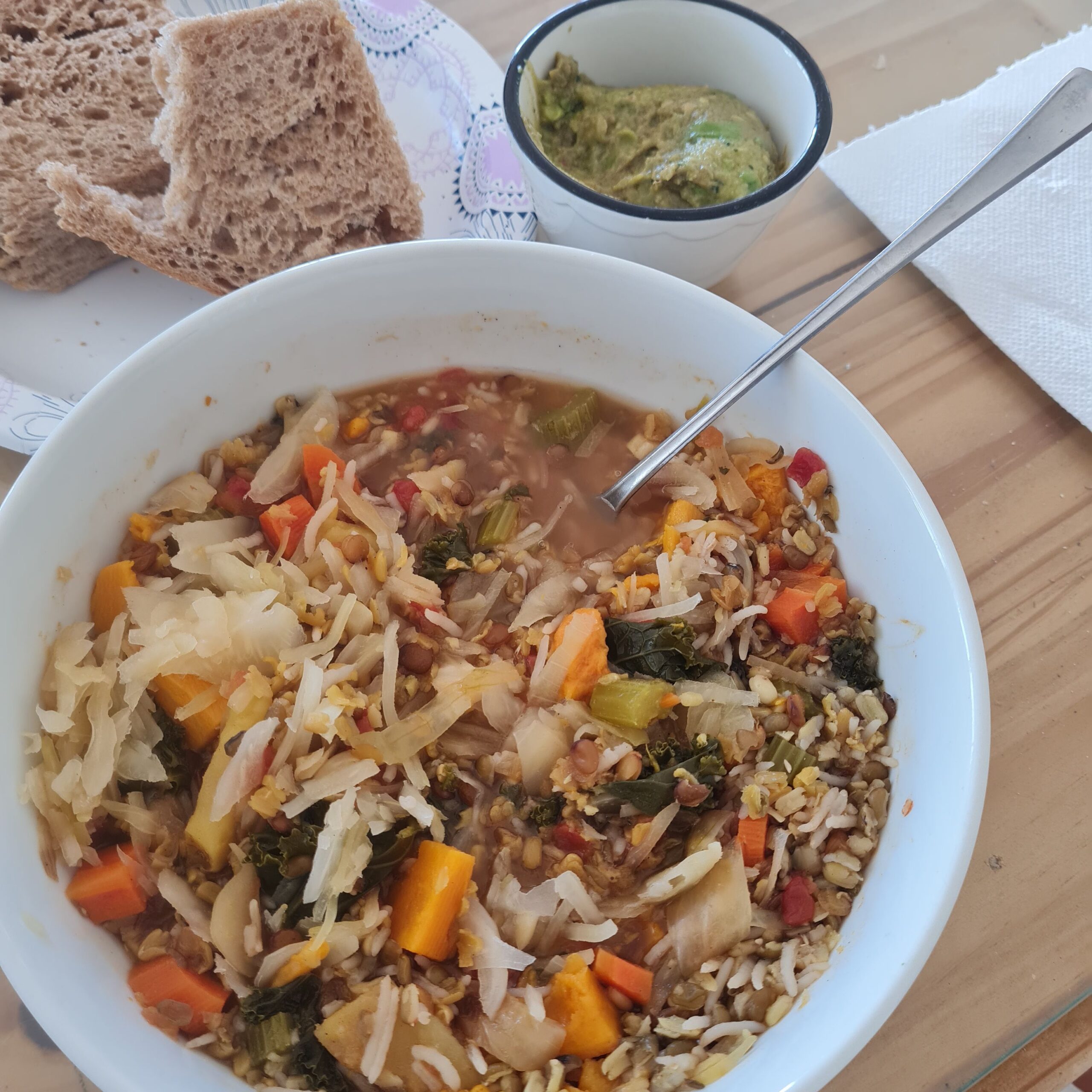 * Grandmother Moroccan soup served over rice-lentil porridge & served w/ hunk of organic whole wheat sourdough bread w/ guacamole