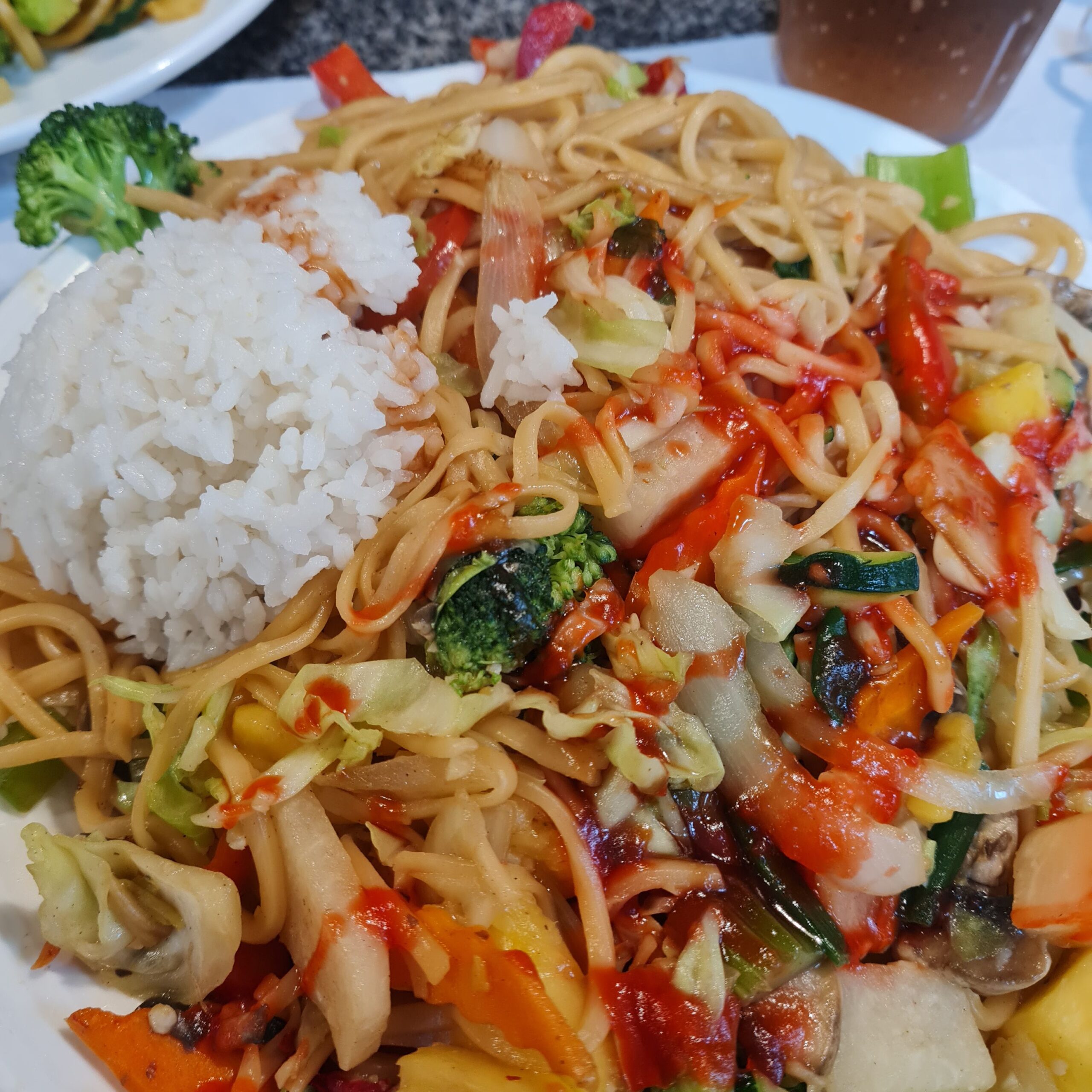 * Mongolian bbq w/ noodles/rice and plain sparkling water w/ shot of soft XL-drink