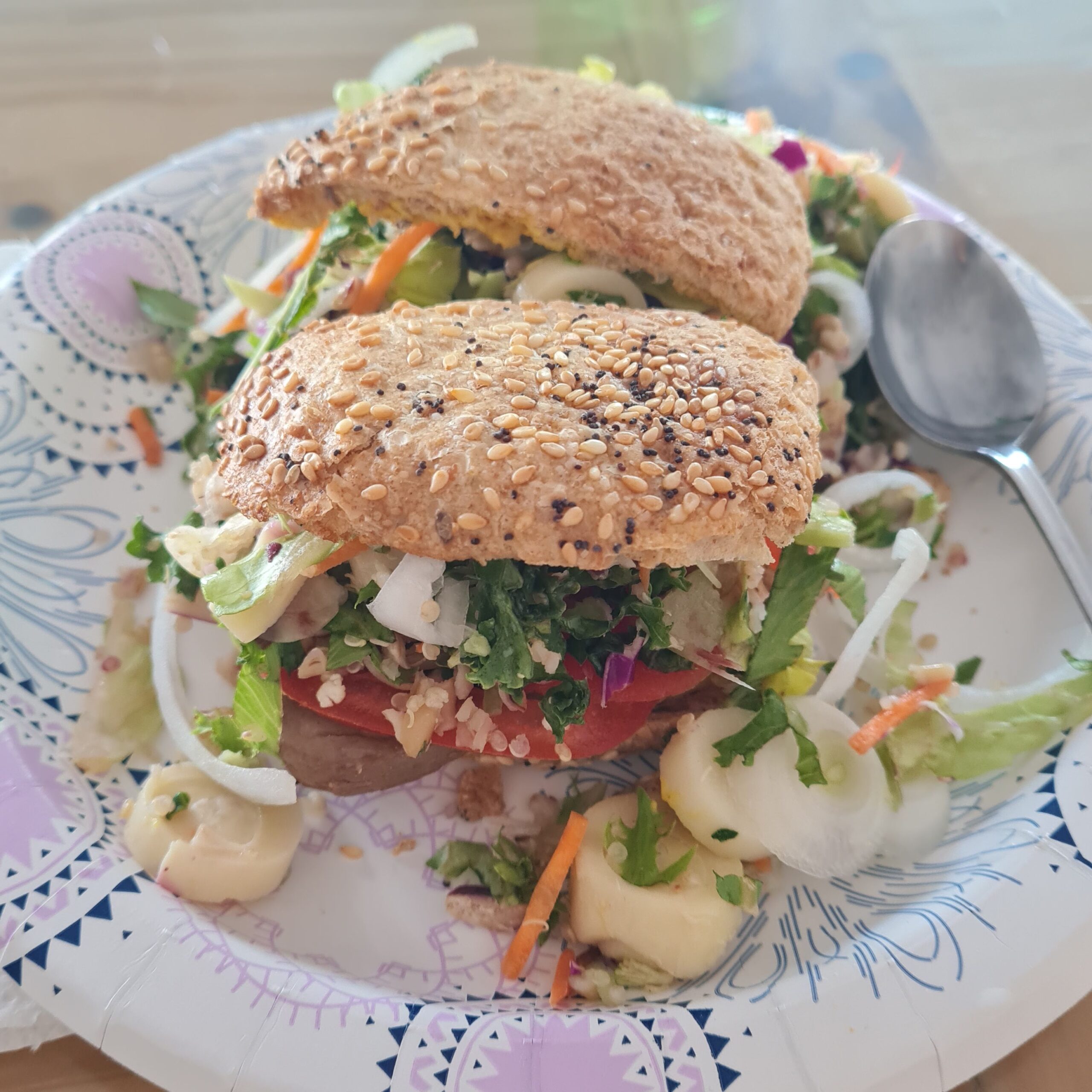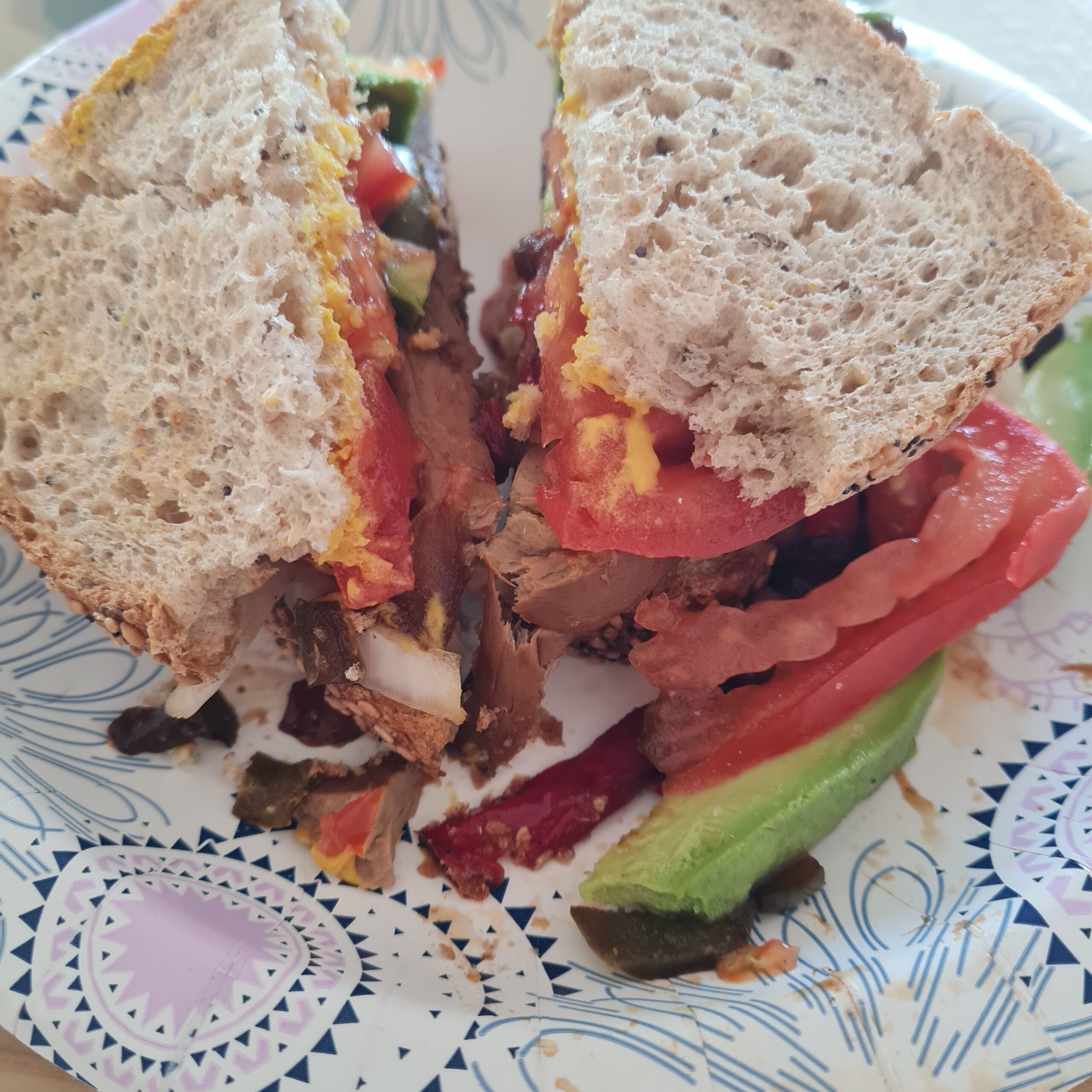 * sandwich w/ wautéed Meati patty, onion, peppers, tomato, avocado, mustard on 9 grain sourdough toast