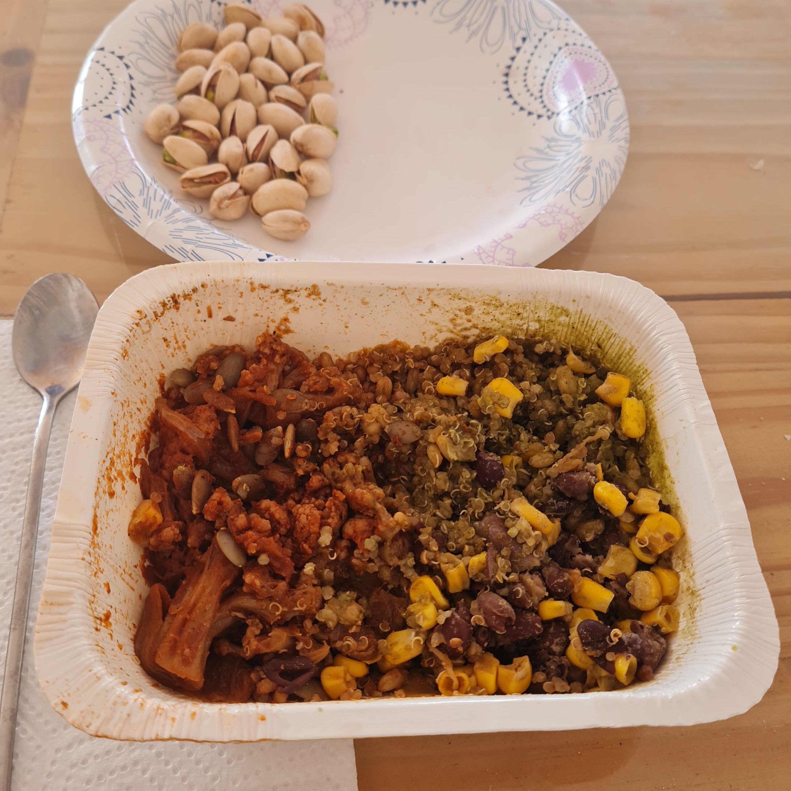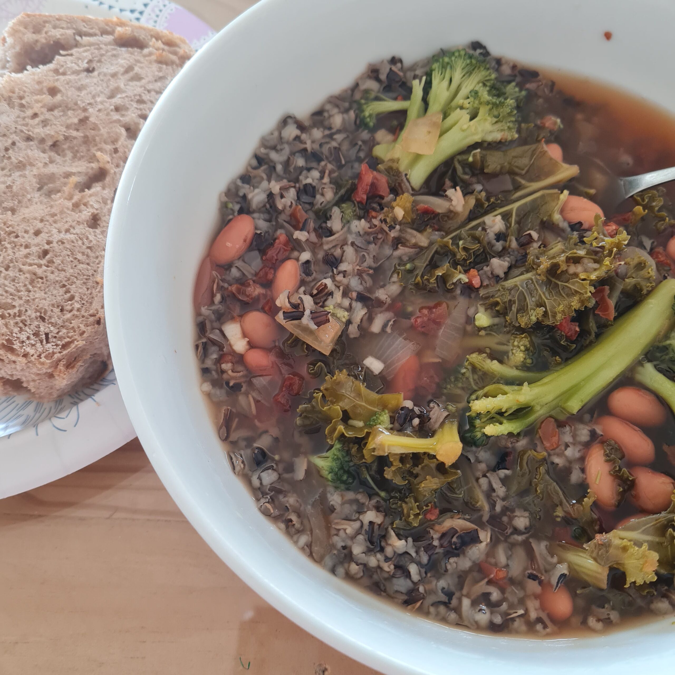 * leftover soup (broccoli, pinto beans, kale, onion, garlic, veg broth, bit of Chipotle pepper, salsa, lemon)
