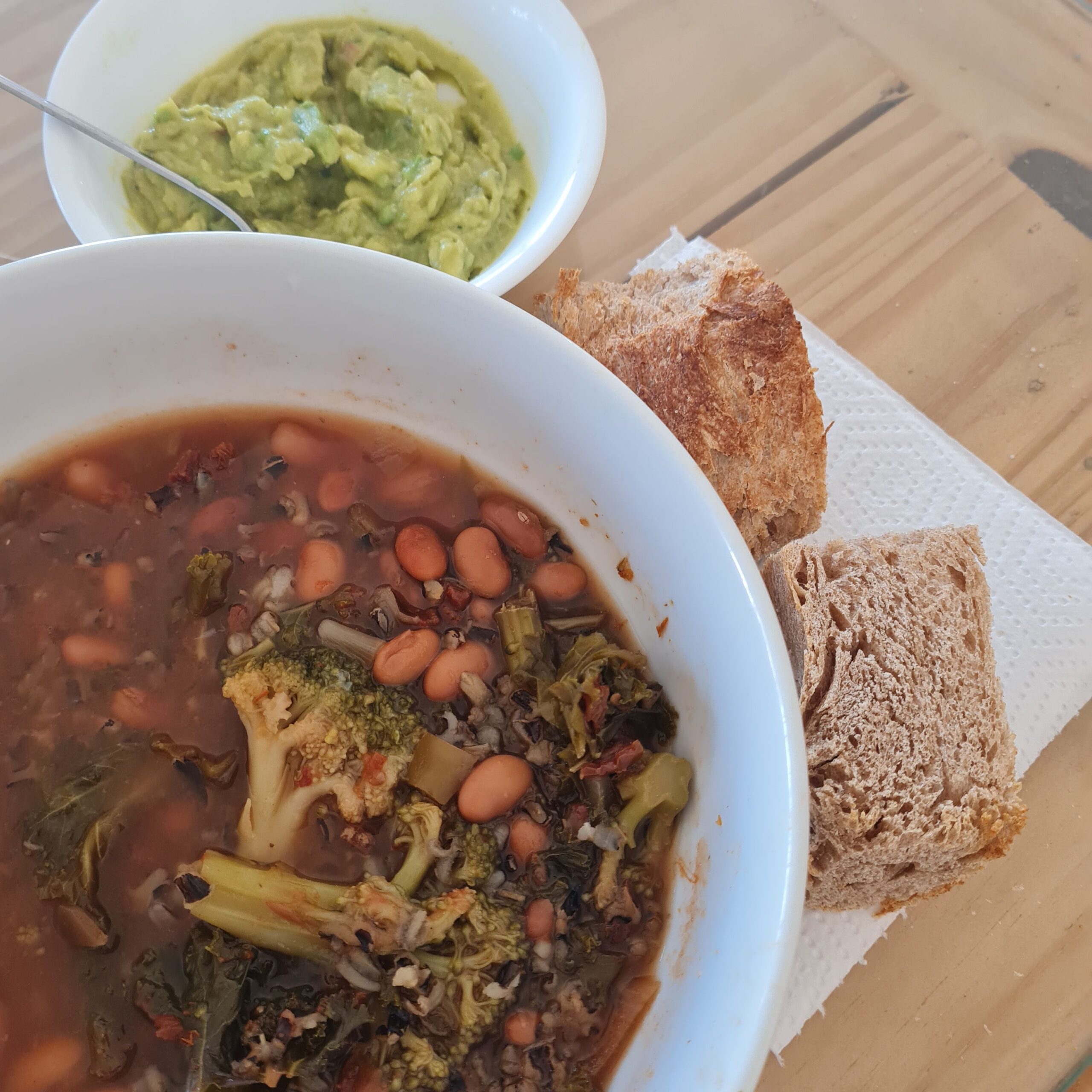 * soup (broccoli, pinto beans, kale, onion, garlic, veg broth, bit of Chipotle pepper, salsa, lemon), served w/ whole-wheat organic sourdough & avocado