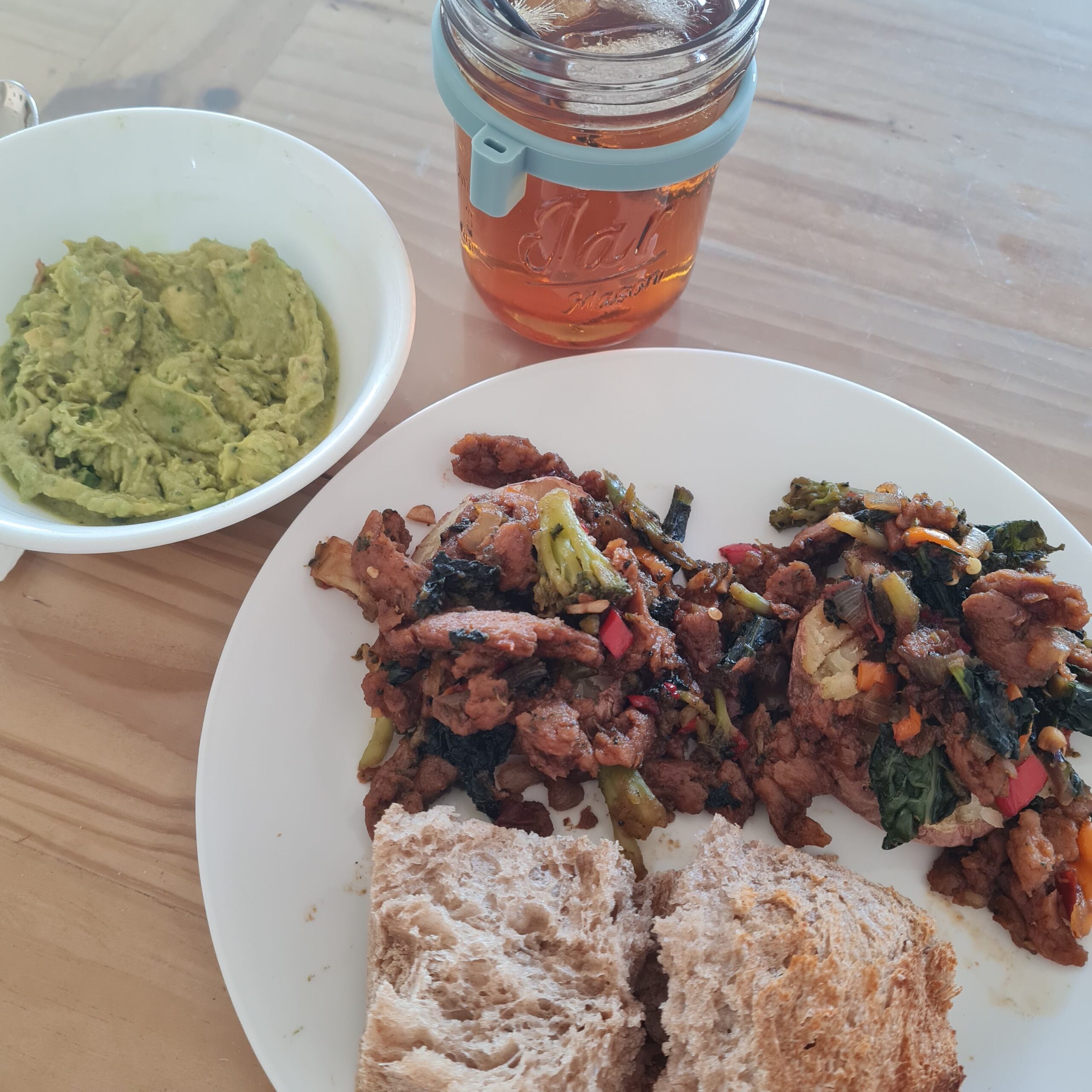 * bbq soy curls served over small baked potato, sourdough, avocado, plain sparkling water w/ shot of Tuscanini Organic XL-soda