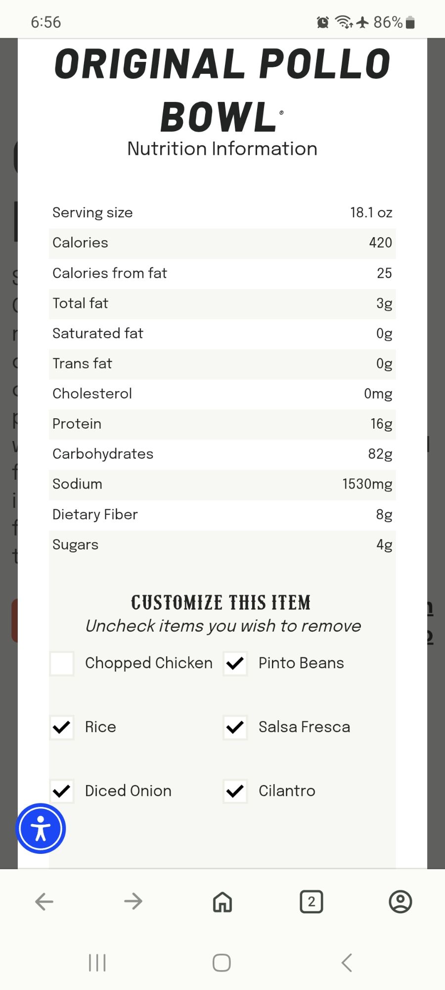 My favorite meal is the Pollo Loco pollo bowl. Today (April 3, 2026) the cost is only $5.00 and if you ask for a senior discount it is only $4.50 !! And only 3 grams fat & 8g fiber w/o the chicken… WOW!