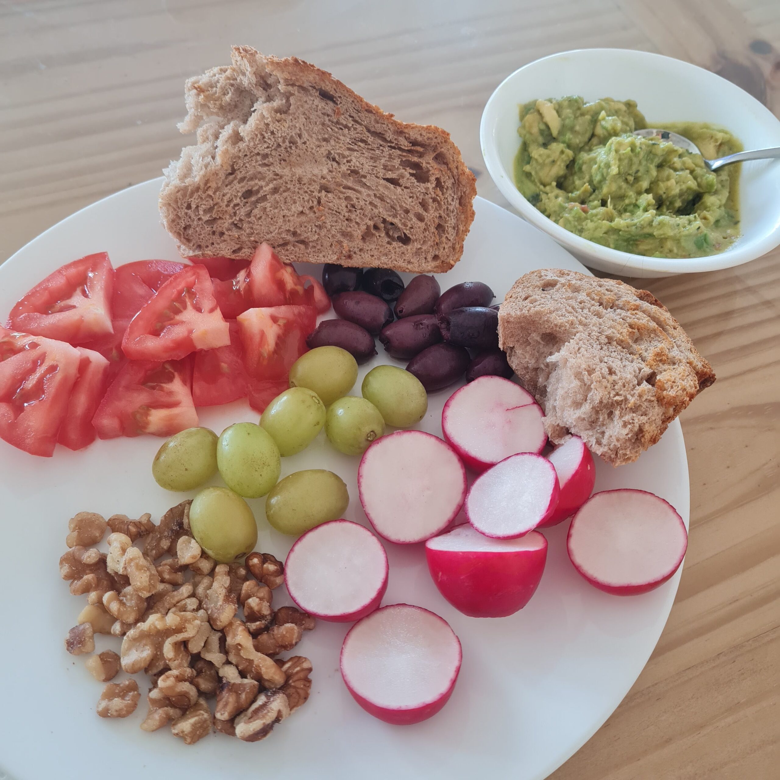 * tray of tomato, radishes kalamata olives, raw walnuts, green grapes, whole wheat organic sourdough toast, avocado