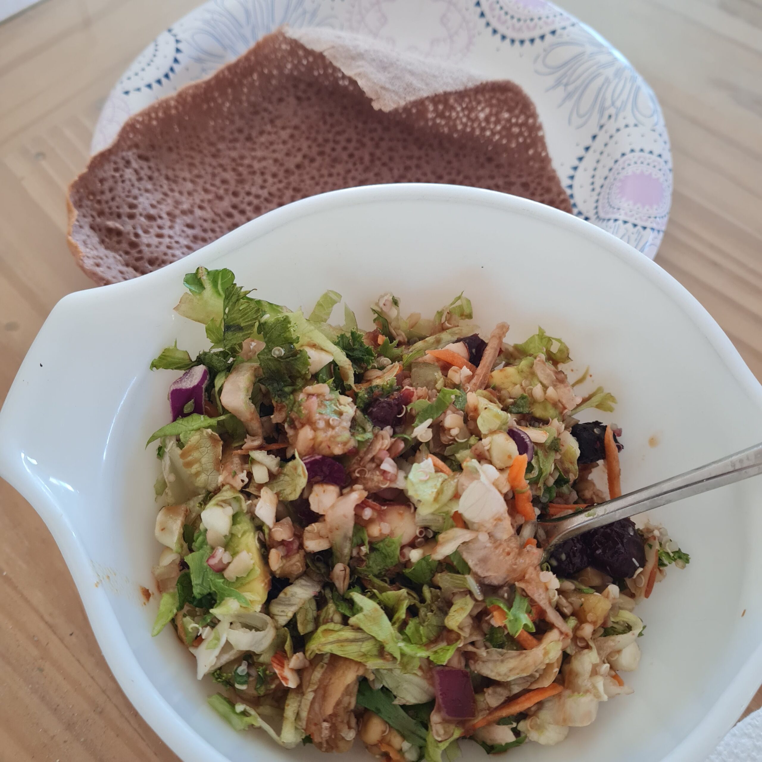 * monster chopped salad (grain & celery salad, organic Mediterranean crunch salad, Japanese sweet potato, tomato bbq salad dressing, avocado w/ teff injera)