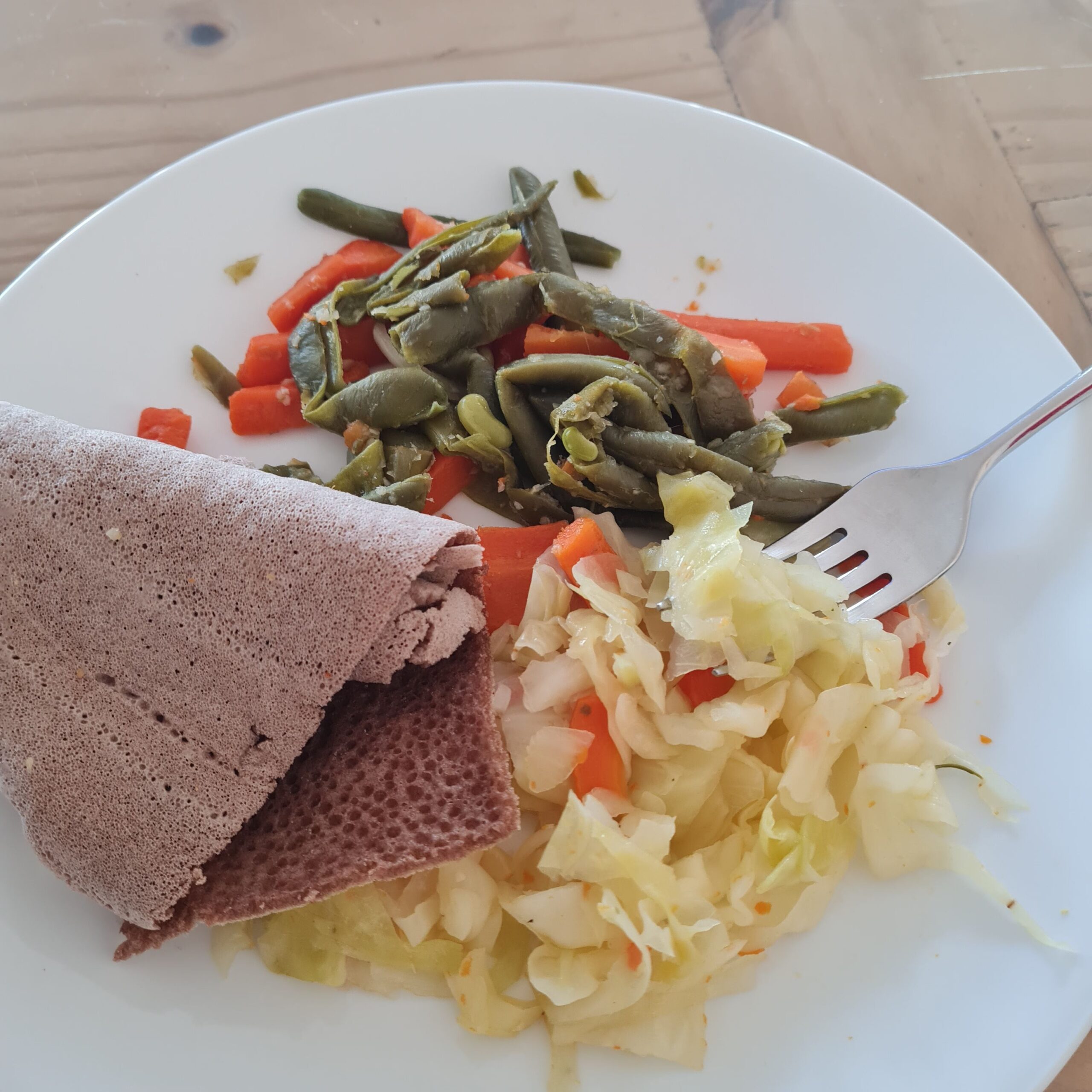 * leftover cabbage, carrot, greenbeans, teff injera from Vegas Little Ethiopa restaurant veggie platter