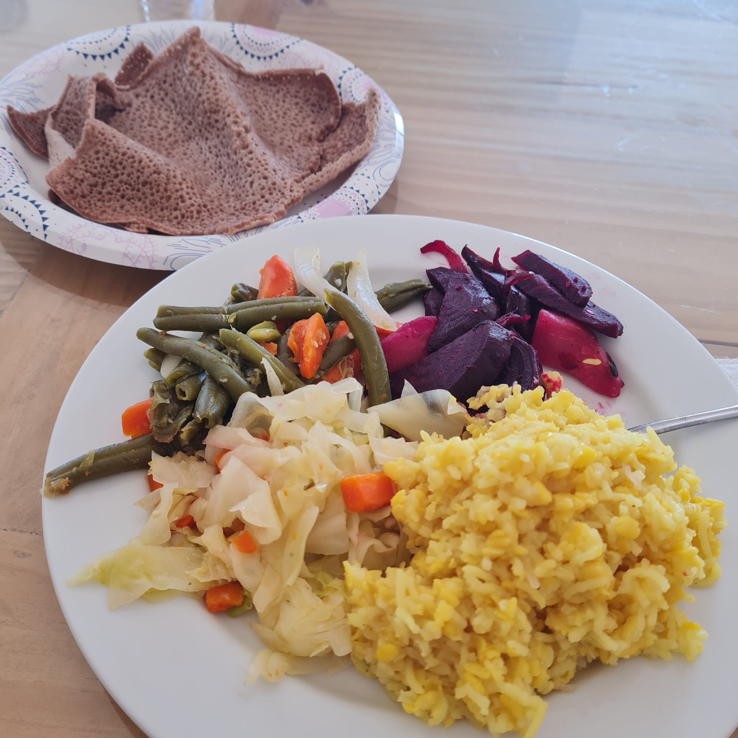* totally oilfree Ethiopian food: cabbage, carrot, onion, green beans, beets, potato, teff injera, homemade Kitchari – organic (yellow split mung dal & basmati rice) served w/ dill pickle relish & plain sparkling water w/ shot of soft XL-drink
