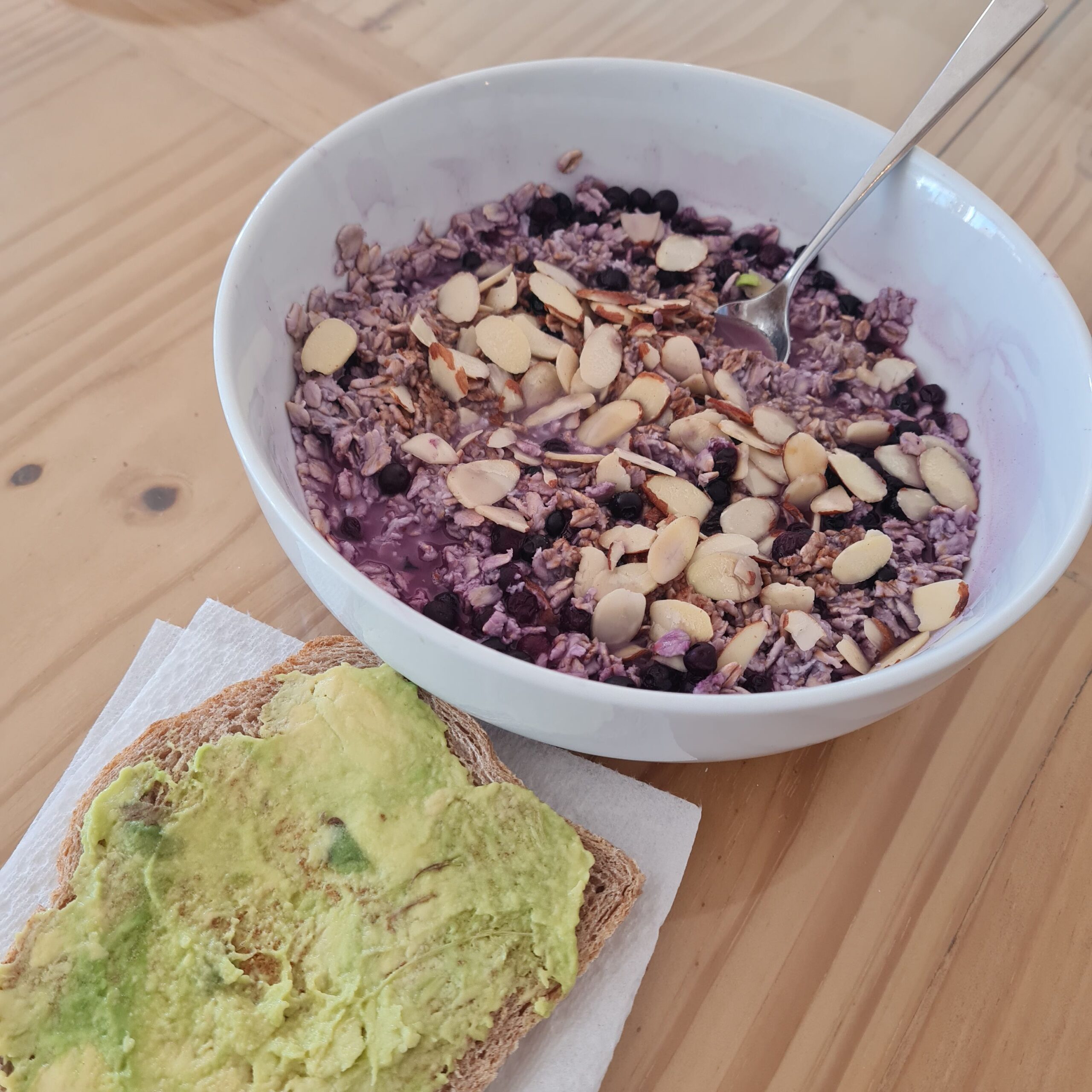 * rolled oats w/ hot water, blueberries, thin sliced raw almonds & avocado sourdough toast