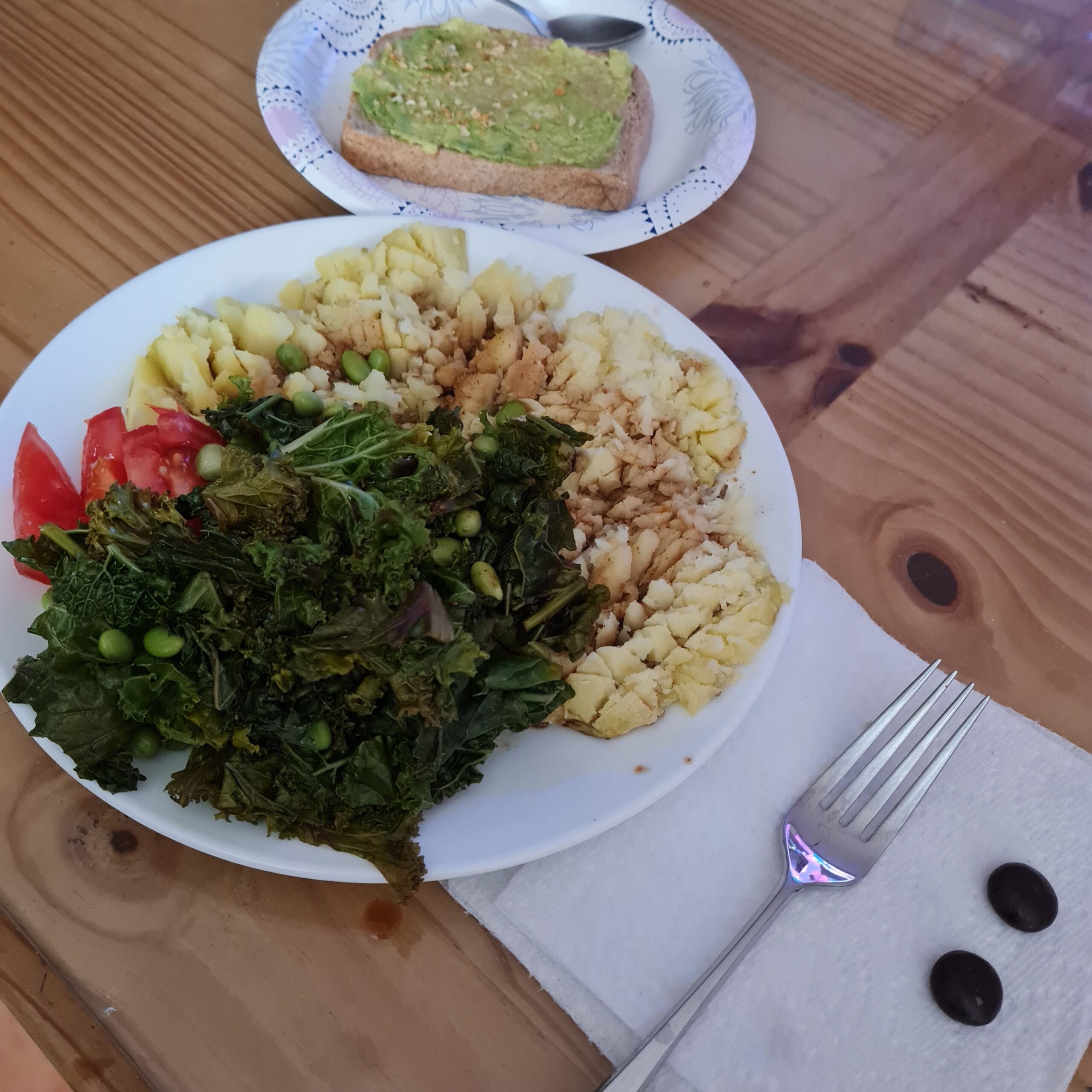 * baked potato, steamed kale & edamame, tomato, avocado toast