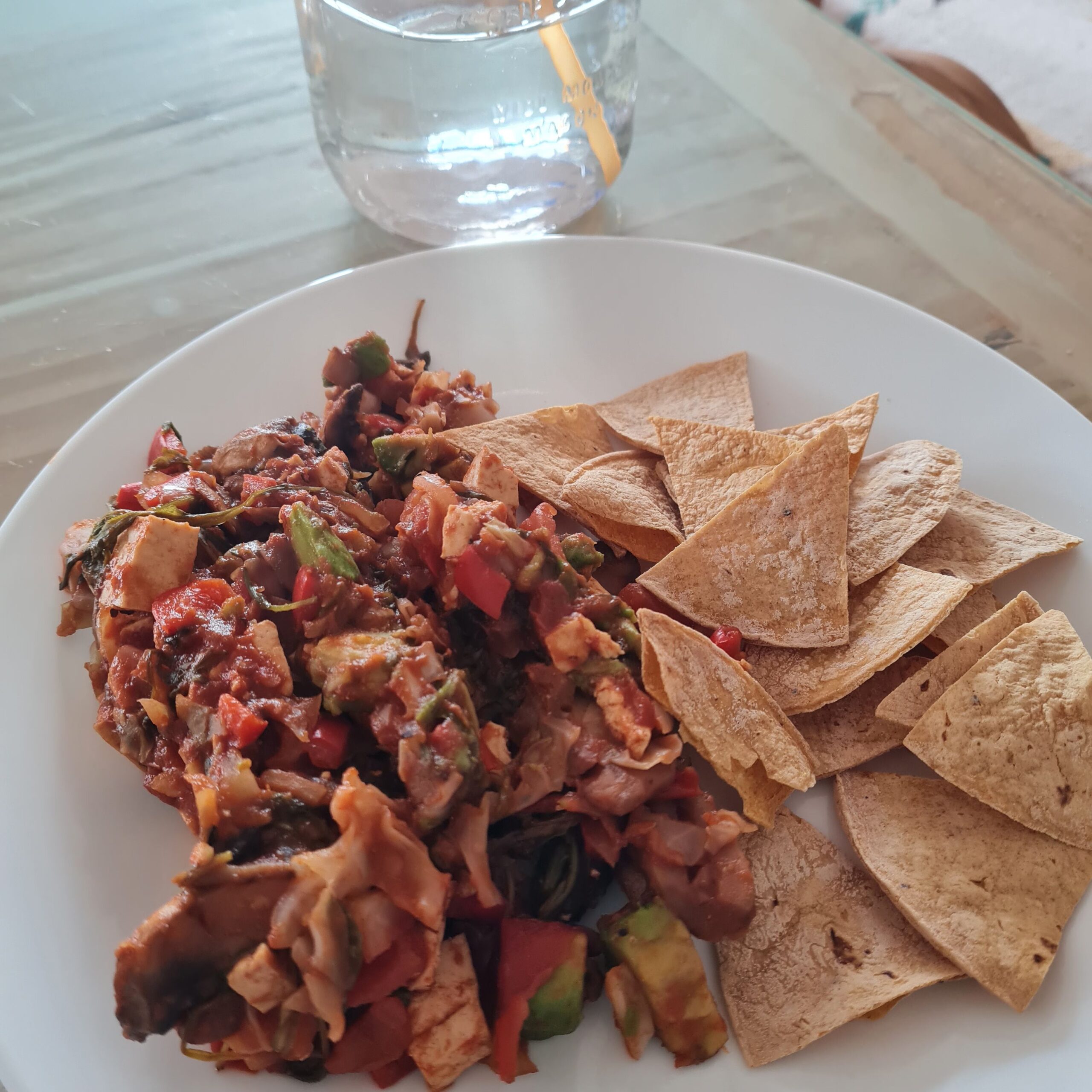 * tofu scramble (w/ onion, cabbage, tomato, mushrooms, arugula, salsa, avocado chunks), served w/ airfried oilfree corn tortillas
