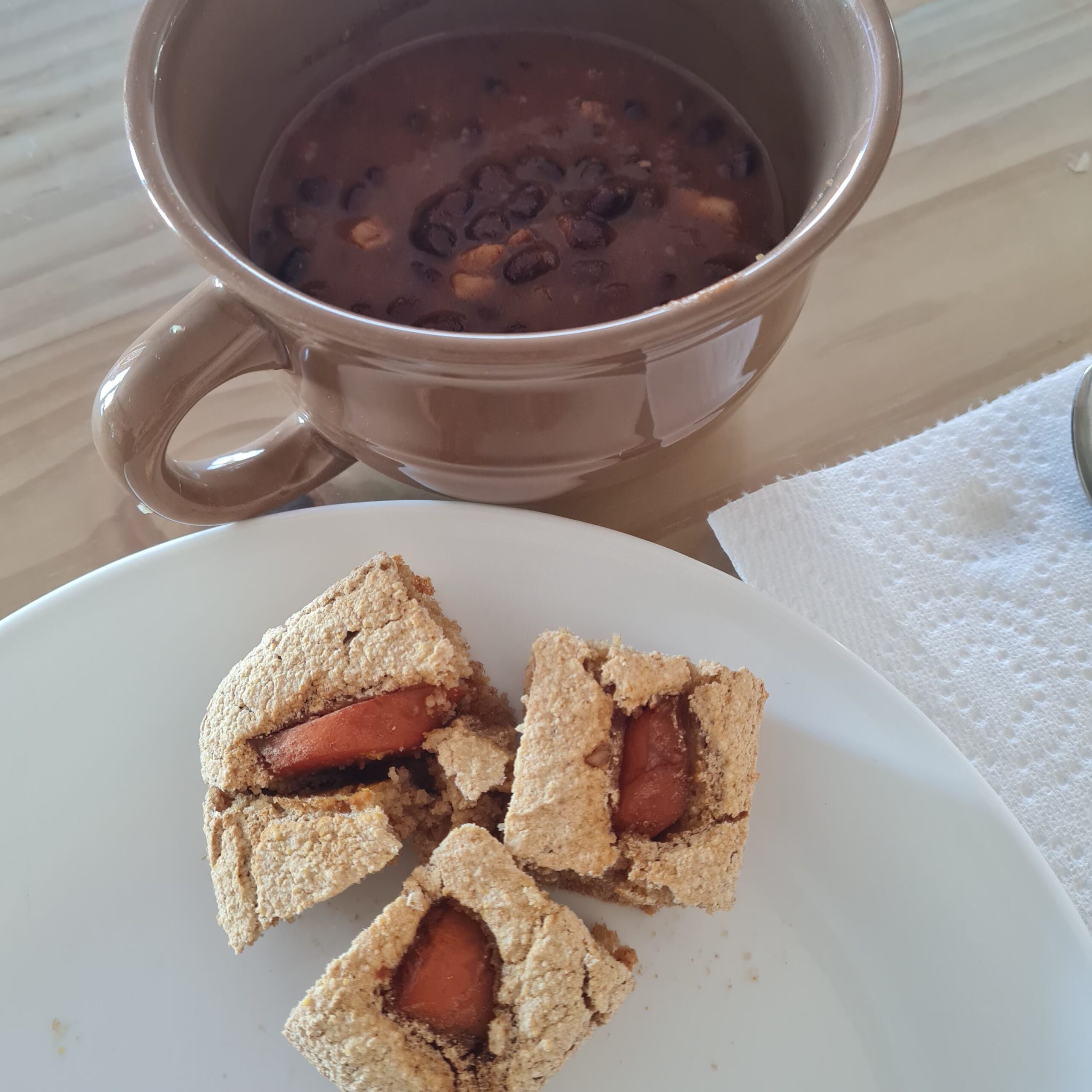 * black bean chili & homemade baked vegan cornbread w/ marinated carrot dog pieces embedded inside