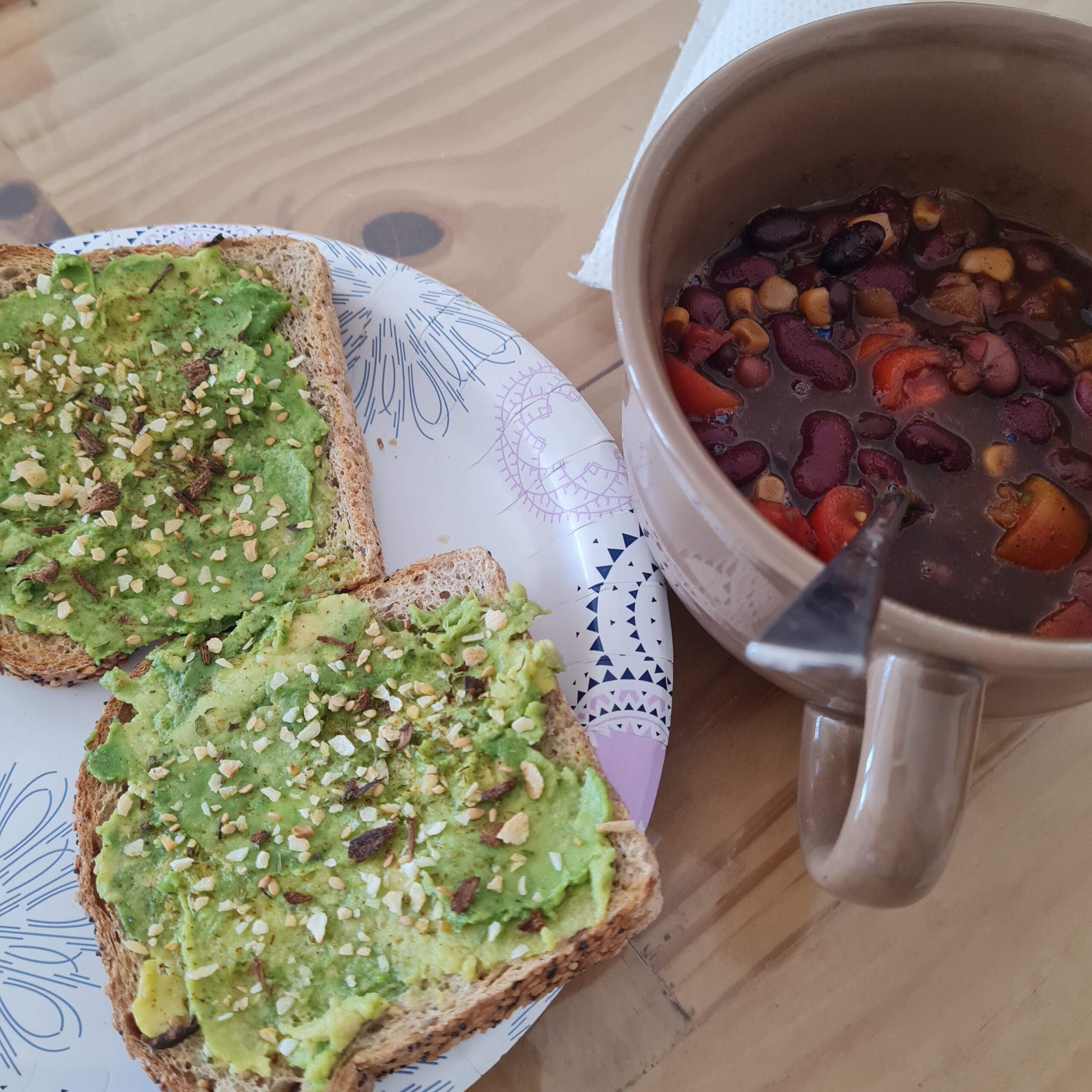 * bean, corn, tomato chili-soup w/ avocado toast on 9 grain sourdough