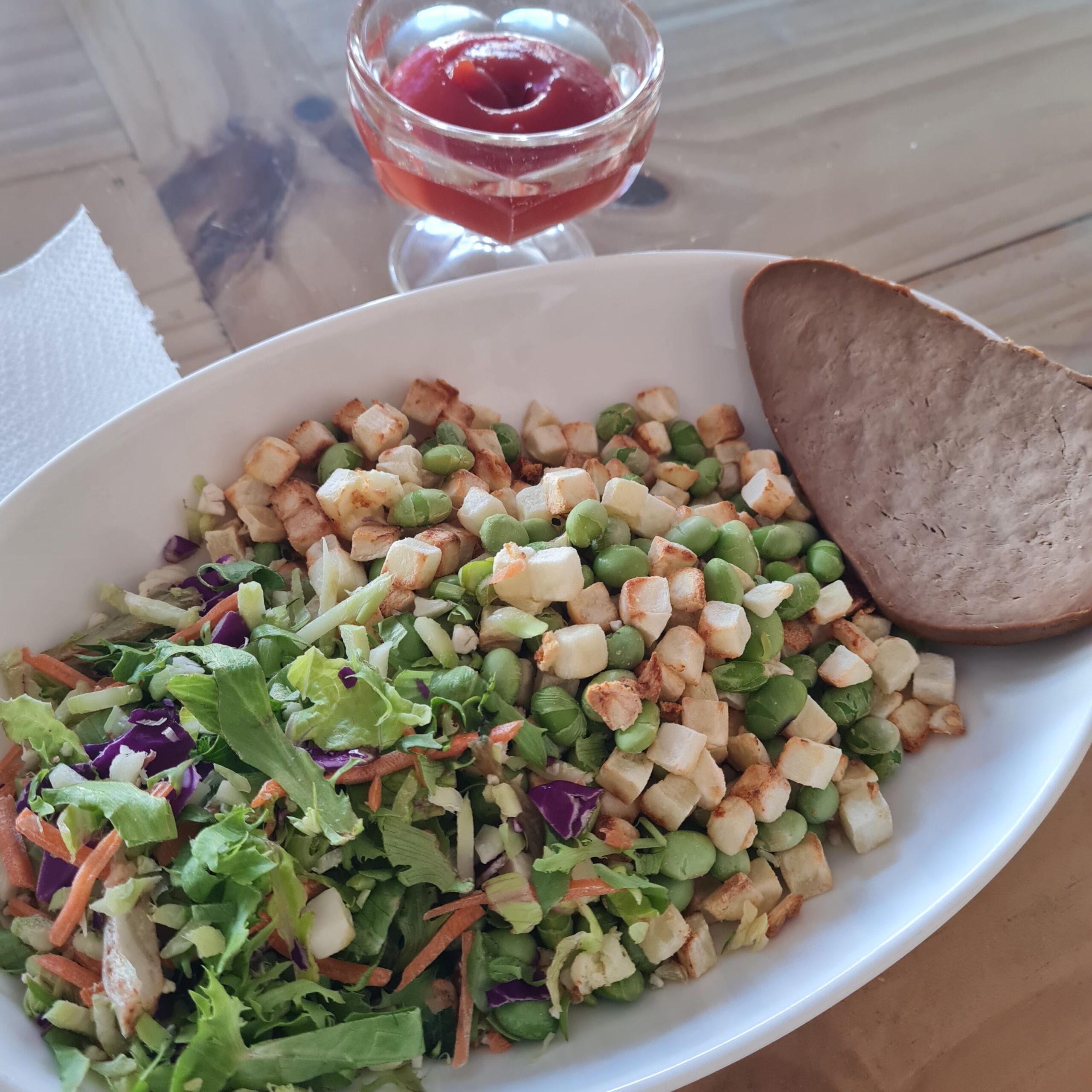 * airfried diced potato, edamame, Meati mushroomi patty, chopped salad & organic ketchup