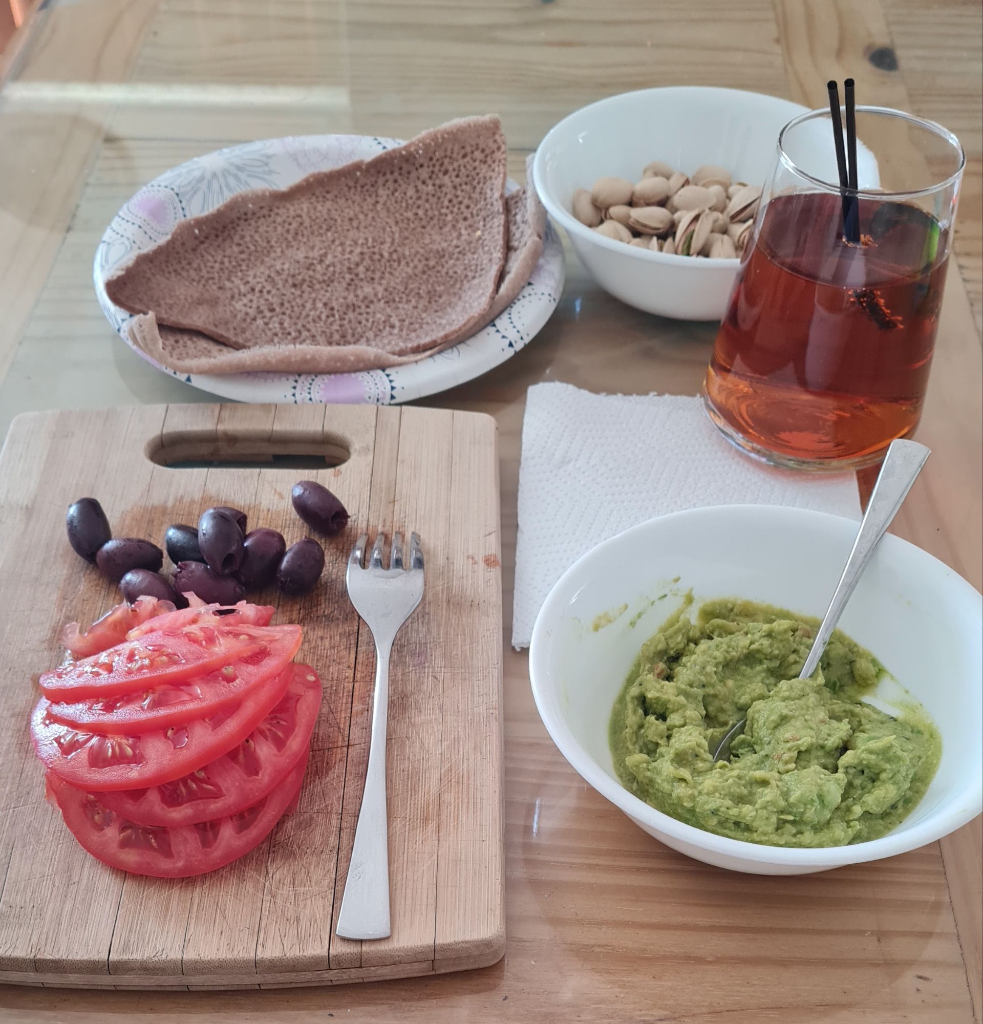 * tomato, olives, avocado, low sodium pistachios, teff injera