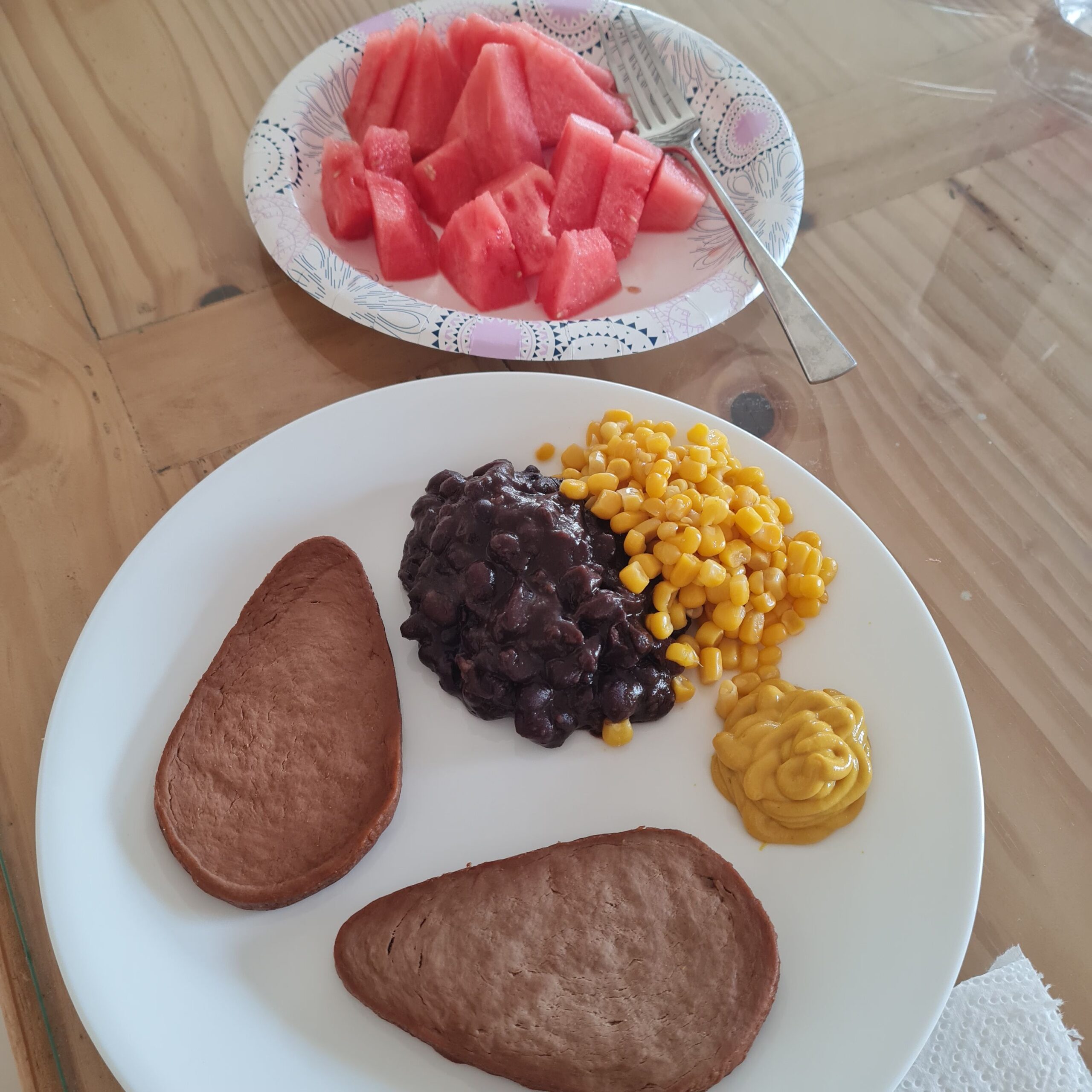 * Meati Brand mushroomi cutlets w/ black beans, corn, mustard & watermelon