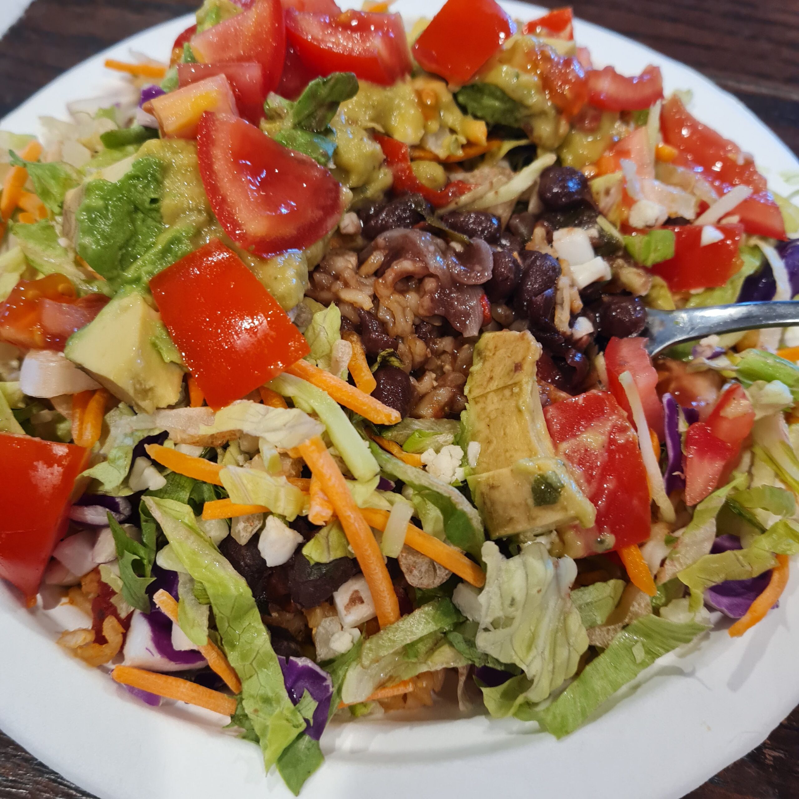 * brown basmati Spanish veggie rice, black beans w/ onion, cilantro, tomato, Mediterranean chopped salad w/ avocado